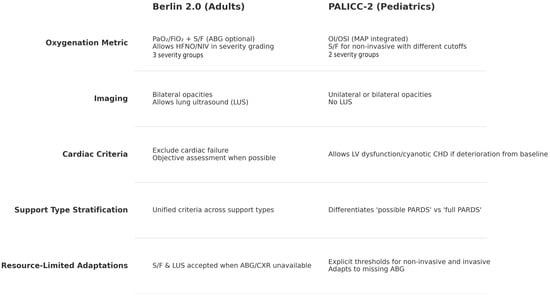 Nevertheless, PALICC-2 is not without challenges. The use of OI and OSI requires accurate, standardized measurement of mean airway pressure, and differences in ventilator management across centers may affect these values independent of the patient’s underlying lung injury. Like Berlin 2.0, PALICC-2’s reliance on SpO2 in OSI and SpO2/FIO2 carries the limitations of pulse oximetry [45,46,47], which can compromise accuracy in certain patient populations and clinical situations. The absence of lung ultrasound from its imaging criteria avoids the pitfalls of operator variability but removes a potentially valuable tool in contexts where chest radiography or CT are not feasible. Finally, the non-equivalence of severity thresholds and primary oxygenation metrics compared to Berlin 2.0 complicates direct cross-age epidemiological comparisons and the synthesis of data in multicenter or mixed-age research.