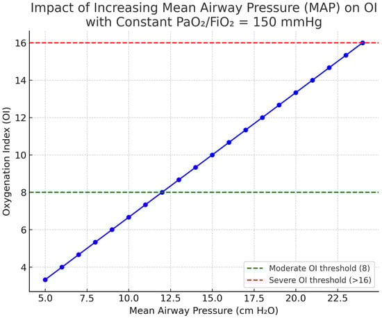 Influence of mean airway pressure (MAP) on the oxygenation index (OI). For a given PaO2/FIO2 (e.g., 150 mmHg for this example), MAP increments raise OI, reflecting the ventilatory burden required to sustain oxygenation. Thus, OI increases linearly together with MAP increments despite a constant PaO2/FIO2 of 150 mmHg. Abbreviations: MAP, mean airway pressure; OI, oxygenation index; OSI, oxygen saturation index; FiO2, fraction of inspired oxygen. OI = (MAP × FIO2 × 100)/PaO2; OSI is the saturation-based analogue using SpO2 instead of PaO2. Image generated using ChatGPT 5.0.