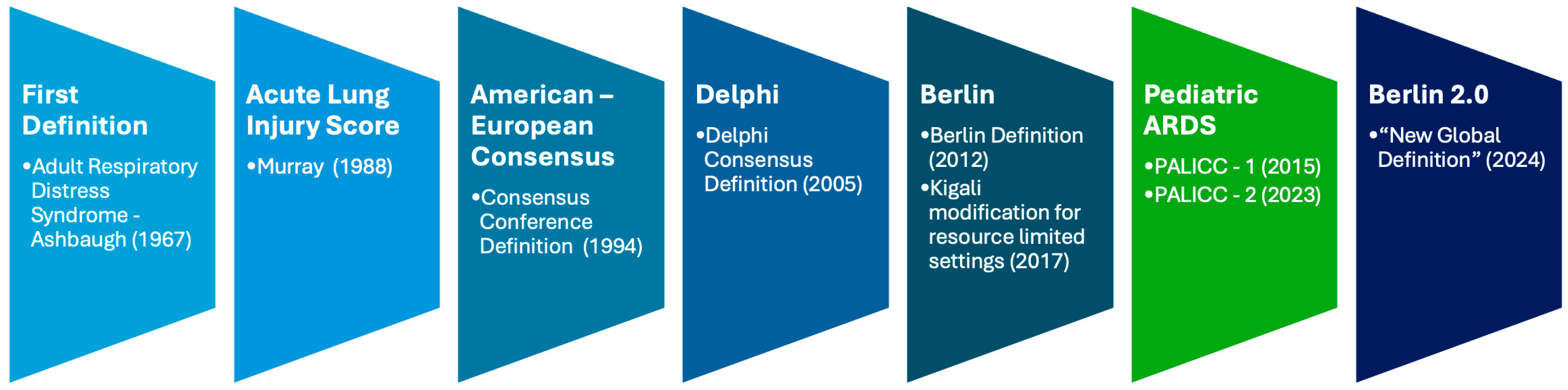 - Matthay, M.A.; Arabi, Y.; Arroliga, A.C.; Bernard, G.; Bersten, A.D.; Brochard, L.J.; Calfee, C.S.; Combes, A.; Daniel, B.M.; Ferguson, N.D.; et al. A New Global Definition of Acute Respiratory Distress Syndrome. Am. J. Respir. Crit. Care Med. 2024, 209, 37–47. [Google Scholar] [CrossRef]