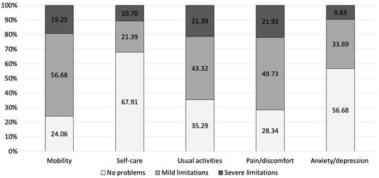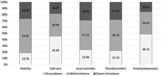 For PJI, the highest proportion of severe limitations was observed in mobility (26.4%), followed by usual activities (28.93%) and pain/discomfort (27.92%). The anxiety/depression dimension had the largest proportion of participants without limitations (48.73%) and the lowest proportion with severe limitations (15.23%) (Figure 1). For FRI, the highest overall limitation burden (i.e., the sum of mild and severe limitations) was observed in the mobility domain, with 75.93% of respondents reporting either mild (56.68%) or severe (19.25%) limitations. Similarly, high levels of limitations were reported for pain/discomfort (71.66%) and usual activities (64.71%) (Figure 2).
