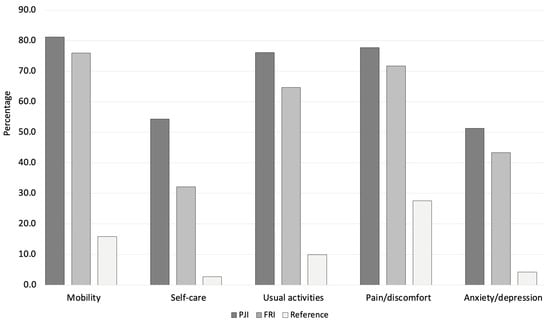 Proportions of patients reporting any limitations in each EQ-5D subdomain for PJI (shown in dark grey), FRI (shown in light grey) and a German reference population (shown in white). All comparisons were statistically significant on a p < 0.001 level.