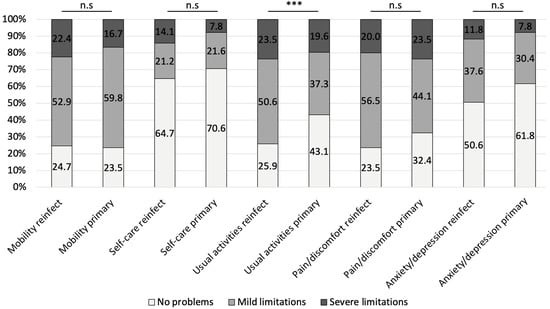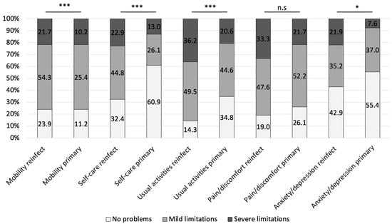 Proportions of patients reporting no problems, mild limitations, and severe limitations in each EQ-5D subdomain for PJI reinfection and primary PJI cases. Statistical comparisons were performed using generalized estimating equations (GEE) with binomial distribution, adjusted for age and sex and clustered by center. Reported significance levels are based on Benjamini–Hochberg false discovery rate (FDR) adjusted p-values. *** FDR-p < 0.001, * FDR-p < 0.05.