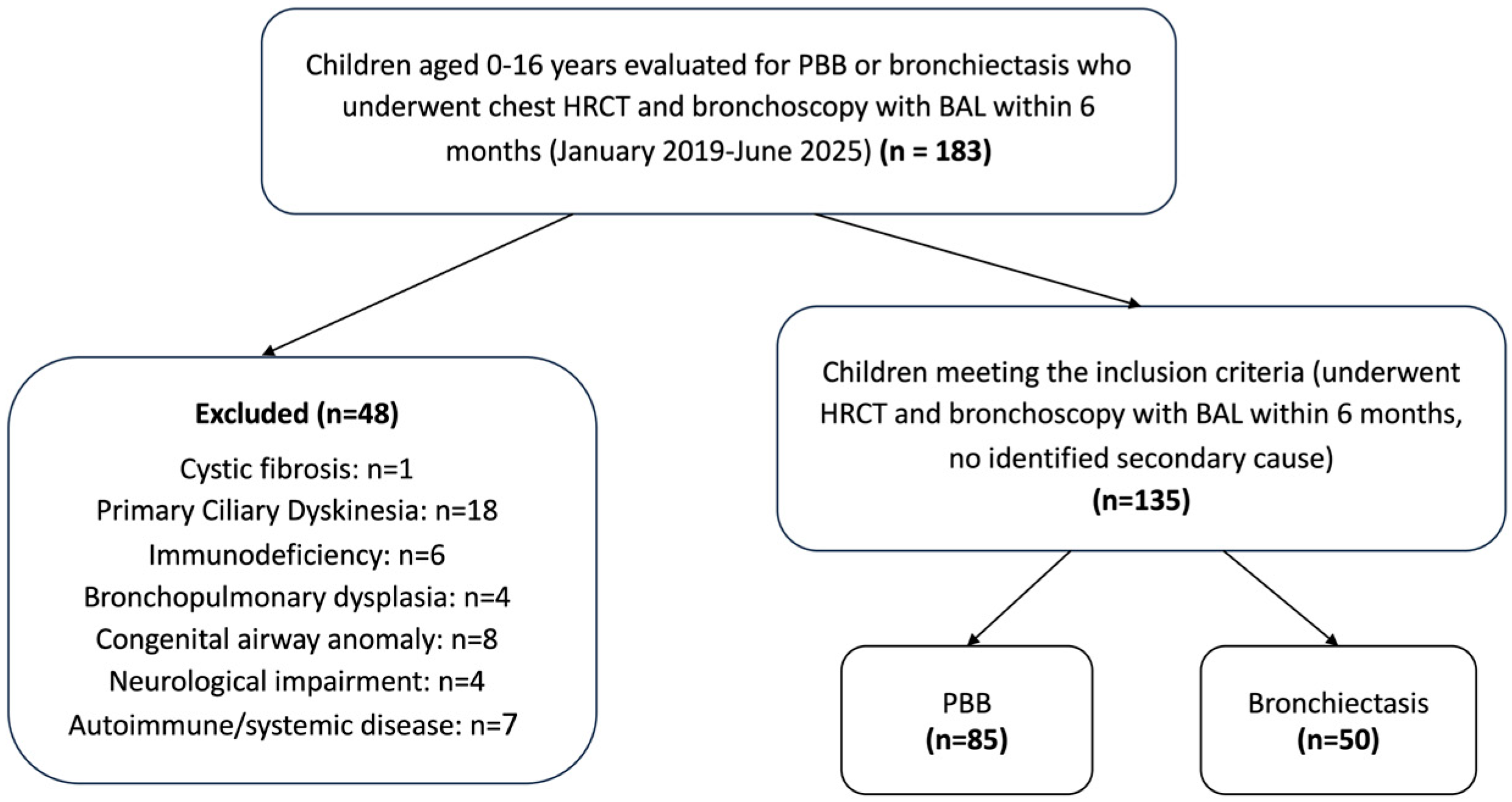 Children aged 0–16 years were eligible for inclusion if they met the diagnostic criteria for either PBB or bronchiectasis and had undergone both flexible bronchoscopy with BAL and HRCT of the chest within six months. Patients were excluded if one or both procedures had not been performed or if the interval between procedures exceeded six months.