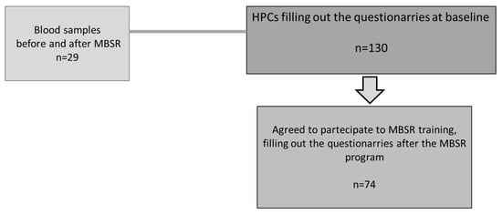A total of 130 participants (mean age 42 ± 11, 115 women), including physicians, nurses, and other HCPs from the two FTGM hospitals, voluntarily filled out the questionnaires at baseline. Then, a quasi-experimental pre–post study without randomization was conducted on 74 subjects (mean age 41 ± 12, 22 women), who agreed to follow an MBSR program between 2022 and 2023. Moreover, blood samples were obtained before and after the MBSR training by a subgroup of participants (n = 29, 25 females, age 48 ± 8 years). The participant flow diagram is reported in Figure 1.