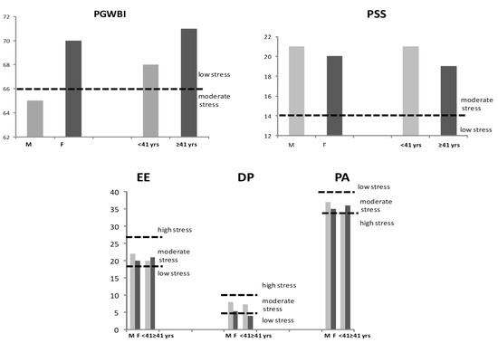 Moreover, distress related to relationships and time disposal was strongly perceived by women, although some items relative to PGWBI and MBI are better in female HCPs than in males. It has been suggested that women retain a greater capacity for emotional regulation and cognitive control than men, which may help to reduce undesirable emotional responses and benefit their overall well-being [39,40]. Instead, men are more likely to internalize their stress and articulate their emotions, without consciously perceiving psychological distress as a factor influencing their overall well-being [39,40].