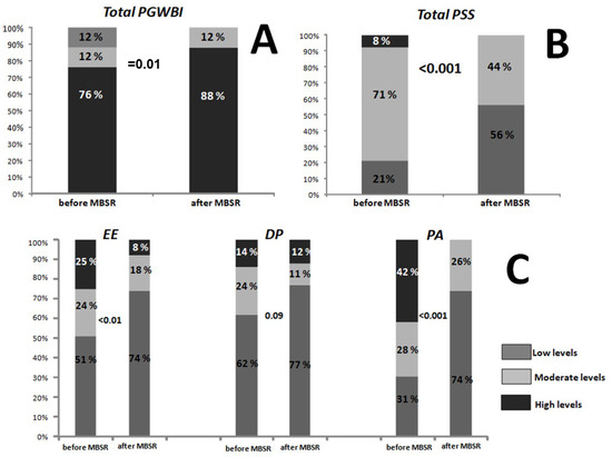 Percentage of participants exhibiting low, moderate or high levels of total PGWBI (A), total PSS (B), and EE, DP, and PA (C) before and after the MBSR program (χ2 test). PGWBI: Psychological General Well-Being Index; PSS: Perceived Stress Scale; EE: emotional exhaustion; DP: depersonalization and detachment from the job; PA: lack of personal or professional accomplishment; MBSR: Mindfulness-Based Stress Reduction.