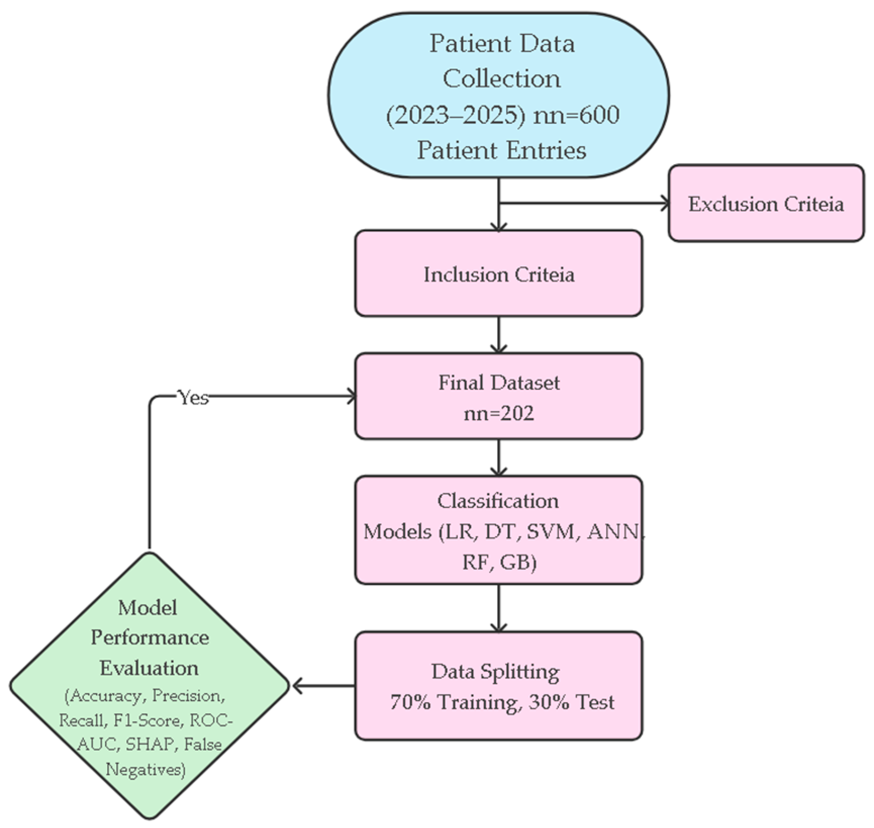 During preprocessing, categorical variables (e.g., sex) were transformed using One-Hot Encoding. Continuous variables were normalized using z-score standardization to eliminate scale sensitivity. The dataset was randomly split into 70% training (n = 141) and 30% test (n = 61) sets. The “stratify” parameter was used to preserve class distribution, and 5-fold stratified cross-validation was applied for model evaluation.