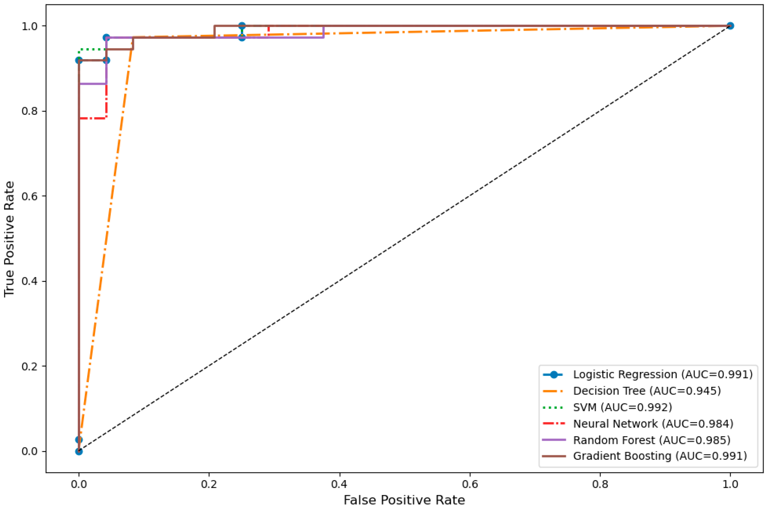 The visual analysis of the models’ discriminative power is presented in Figure 2 through ROC curves. The SVM, Logistic Regression, and Gradient Boosting models demonstrated superior performance in terms of AUC values, while the Decision Tree algorithm exhibited relatively limited discriminative power with a lower AUC of 0.945. Overall, the ROC curves revealed that all models possessed high sensitivity and specificity.