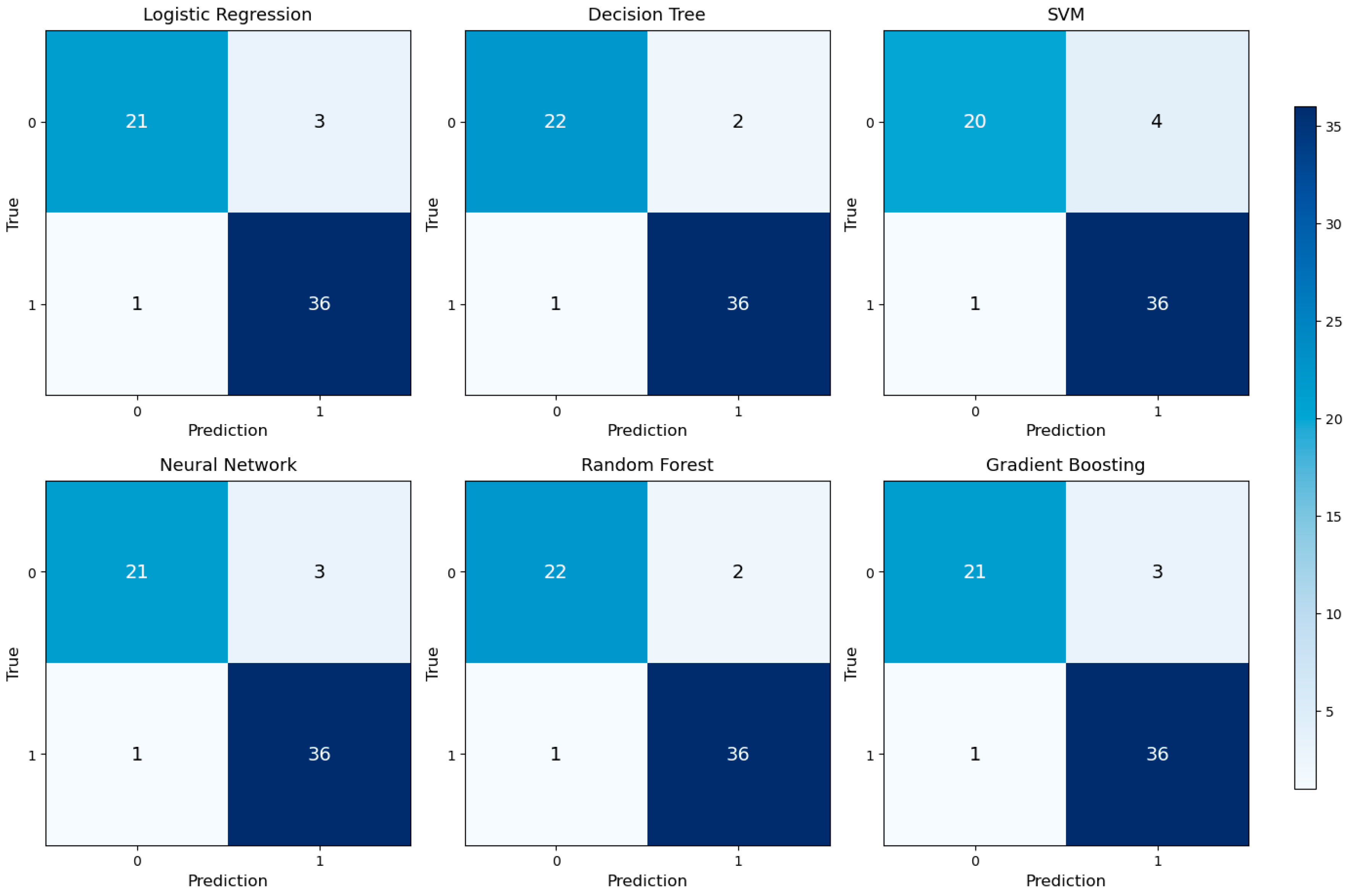 Six different machine learning models (Logistic Regression, Decision Tree, SVM, Neural Network, Random Forest, Gradient Boosting) were trained using the collected data and evaluated on the test set. Their performance metrics are summarized in Table 3. The models with the highest accuracy and F1-score were the Decision Tree and Random Forest (accuracy = 0.951, F1 = 0.960). In terms of area under the ROC curve (AUC), the SVM model achieved the best performance (AUC = 0.992). According to 10-fold cross-validation, the Random Forest model demonstrated the highest average accuracy with the lowest standard deviation (CV = 0.984 ± 0.009), indicating strong model stability.