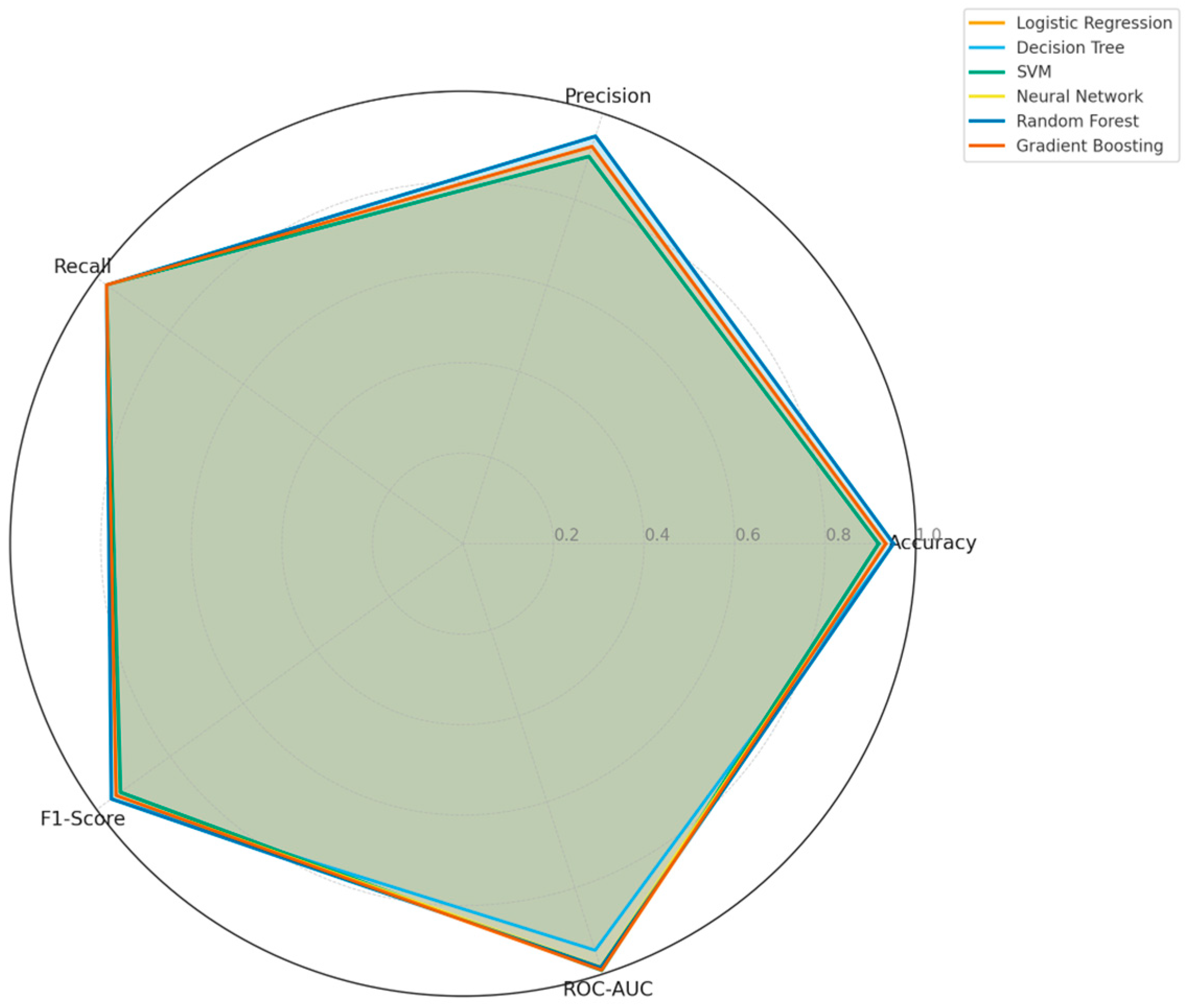 Finally, a radar chart presented in Figure 5 was used to compare the multi-dimensional classification performances of all models. The chart provides a holistic view of Accuracy, Precision, Recall, F1-Score, and ROC-AUC metrics. Overall, SVM, Logistic Regression, and Gradient Boosting performed best in ROC-AUC and recall, whereas Random Forest and Decision Tree models showed stronger results in terms of F1-score and accuracy. This analysis highlights the importance of multi-criteria optimization rather than relying on a single metric when selecting the optimal model.