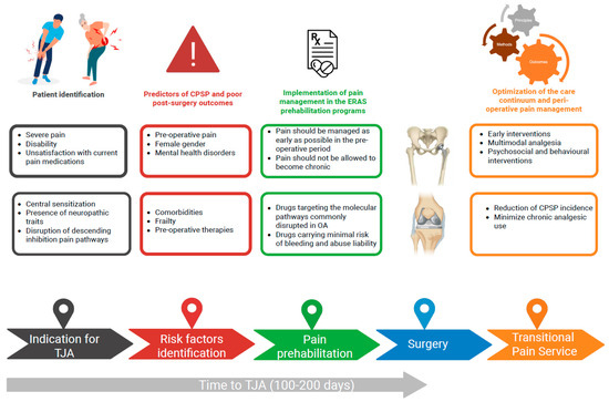 Despite advances in our understanding of specific mechanisms of pain, the most frequently prescribed pain treatments lag far behind our knowledge, with a significant proportion of patients with advanced stage OA taking pain medications that do not target the underlying pain mechanisms appropriately across OA-associated pain patterns over time [108]. To date, one in four patients have been taking NSAIDs, with their use increasing substantially (one in three patients) as the time of surgery approaches. The use of opioids significantly increases during the pre-surgery period, suggesting the presence of relatively high levels of pre-operative pain not adequately controlled by previous pharmacological trials. To this end, pain-relieving medications that target the pain mechanisms characterizing the course of OA pain and contribute to its chronification, including both ascending opioid pathways and non-opioid descending pathways, may hold greater potential to manage pain effectively during the wait-list period. Interventions preventing pain chronification may be more successful if a tailored assessment of vulnerability factors can be obtained [60]. In this scenario, frailty assessment should be implemented incrementally in routine patient preparation for TJA to minimize the risk of CPSP. Furthermore, it is also important to manage analgesics in the pre-operative period within the context of ERAS protocols, and “pain prehabilitation” should be integrated in such routine practice along with educational interventions to optimize patients’ ability to manage and cope with pain. Pain catastrophizing, kinesiophobia, and ineffective pain-coping methods affect patients’ physical capabilities and can impede the effectiveness of pain management and interventions. Managing patient expectations of pain associated with TJA remains critically important [6]; unmet pre-operative expectations lead to patient dissatisfaction post-operatively [109]. To this end, at every pre-operative evaluation, clinicians should talk with patients about their desires and expectations because these factors play a key role in predicting outcomes and satisfaction after elective orthopedic surgery.