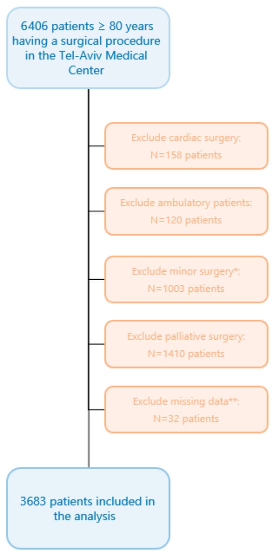 Flow chart. * Minor surgery was defined as an operation magnitude classification of “minor” in accordance with the operation severity component of the Physiological and Operative Severity Score for the Enumeration of Mortality and Morbidity (POSSUM) [23,24,25]. ** Missing crucial data were defined as missing mortality data for foreign residents not properly reported in the National Mortality Registry.