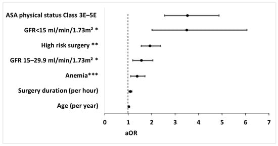 Forest plot of independent risk factors for poor postoperative recovery in the multivariable analysis. Risk factors independently associated with poor postoperative recovery, as reflected by days alive and out of hospital during the initial 90 postoperative days (DAOH90) ≤ 45 in the multivariable analysis. Circles represent adjusted odd ratios, while bars extend to the corresponding 95% confidence intervals. aOR, adjusted odds ratio; CI, confidence interval; ASA, American Society of Anesthesiologists; GFR, glomerular filtration rate. * GFR was categorized according to the Kidney Disease Improving Global Outcomes (KDIGO) categories for GFR [30,33]. ** High-risk surgery was defined as the operation magnitude classification of major/major+ in accordance with the operation severity component of the Physiological and Operative Severity Score for the Enumeration of Mortality and Morbidity (POSSUM) [23,24,25]. *** Anemia was defined as hemoglobin < 13.0 g/dL for males or <12.0 g/dL for females [32].