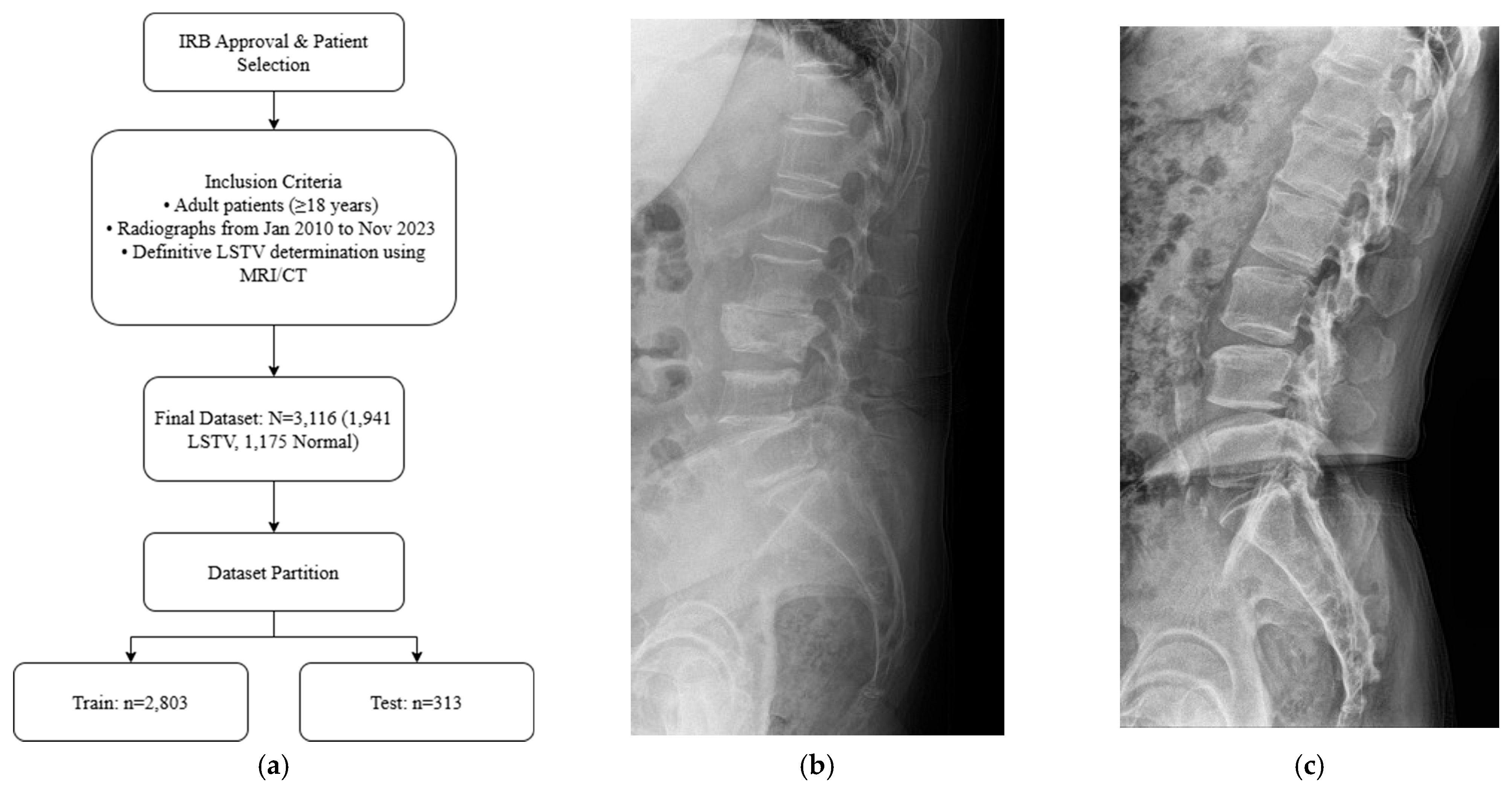 (a) Flow diagram of patient selection and dataset partitioning. Adult patients (≥18 years) with standing lumbar radiographs and MRI/CT-confirmed LSTV were included (n = 3116; 1941 LSTV, 1175 normal) and divided into training (n = 2803) and independent test (n = 313) sets. (b) Representative lateral radiograph showing LSTV with lumbarization of the S1 vertebra and morphological alteration of the L5–S1 junction. (c) Representative radiograph of a normal lumbar spine illustrating a well-defined lumbosacral junction and distinct separation between the L5 vertebra and sacrum.