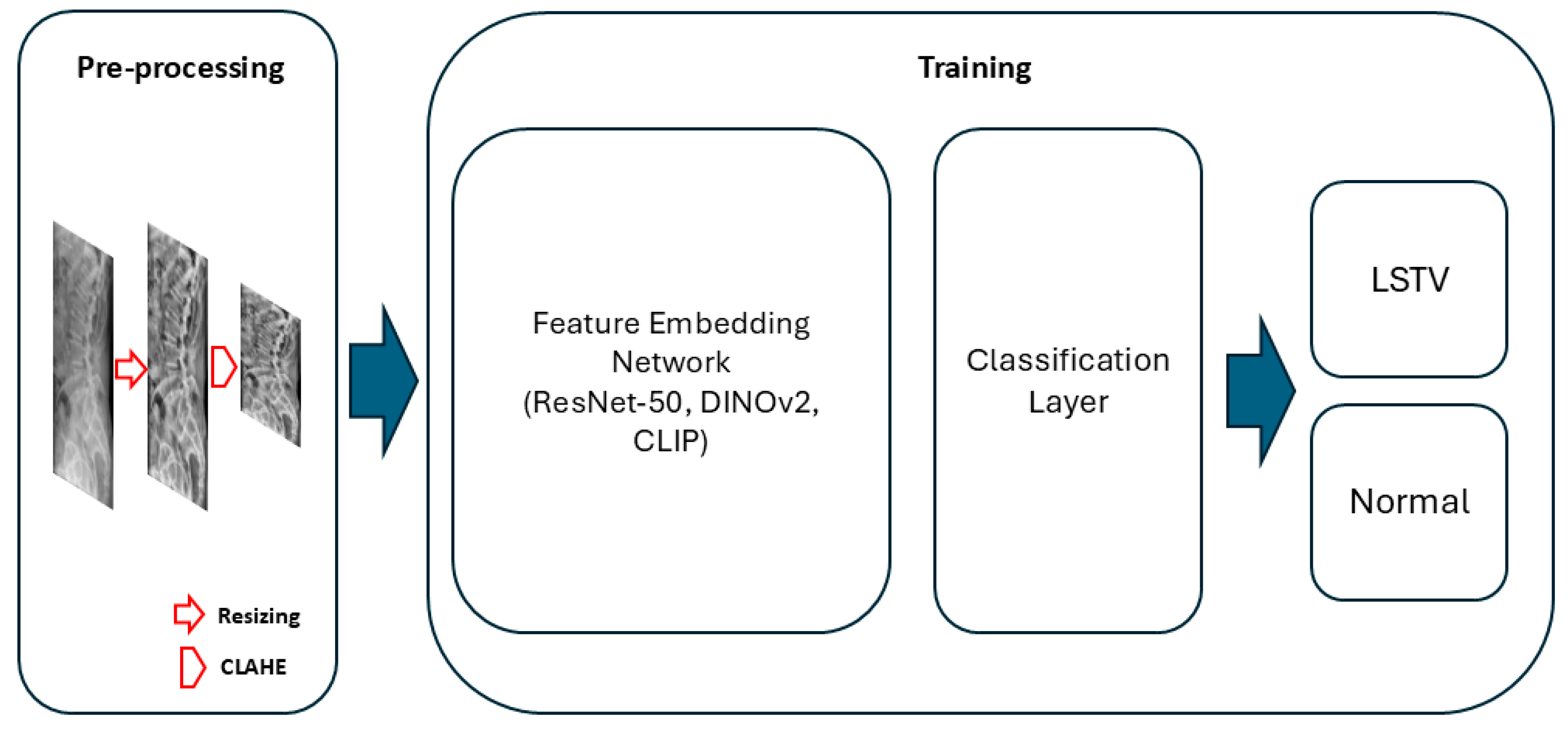 Overview of the proposed deep learning pipeline for LSTV classification. During preprocessing, lumbar spine radiographs were resized to 224 × 224 pixels and contrast-enhanced using contrast-limited adaptive histogram equalization (CLAHE). The processed images were then encoded by a feature embedding network, followed by a classification layer performing binary classification to predict LSTV or normal anatomy.