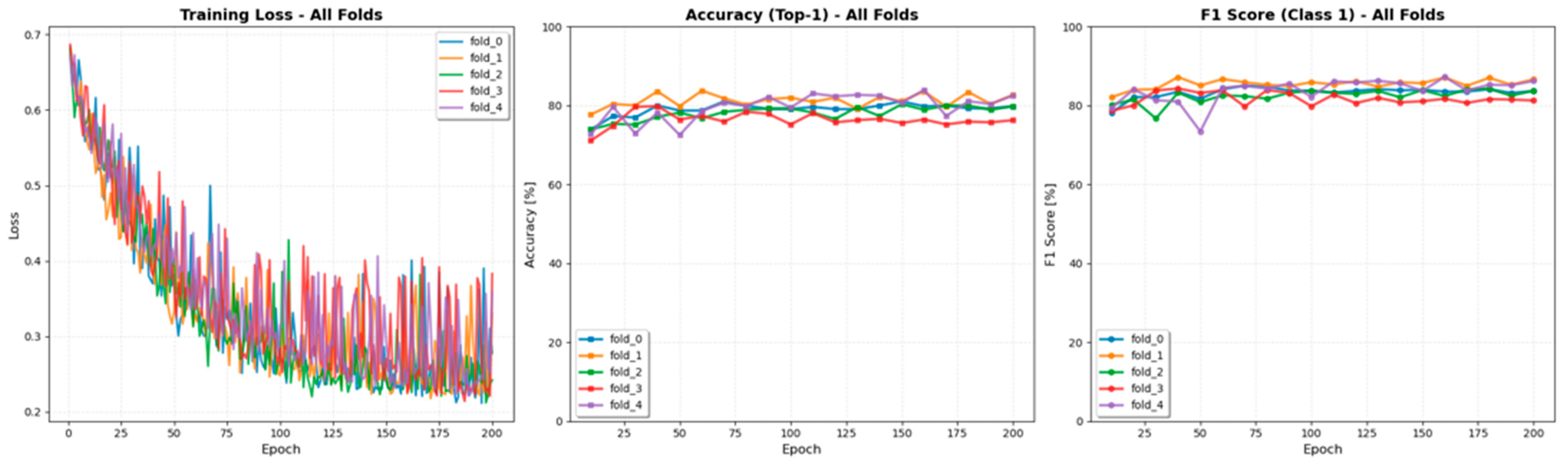 The ResNet-50 model, which achieved the highest accuracy among all tested architectures, was selected for cross-validation experiments. The 5-fold cross-validation on the training set confirmed the model’s stability and robustness. Performance remained consistent across all five folds, with a mean accuracy of 81.8% ± 1.9% and a mean f1-score of 85.5% ± 1.5%, indicating stable training without significant overfitting. The fold-wise variations in accuracy, F1-score, and training loss are illustrated in
