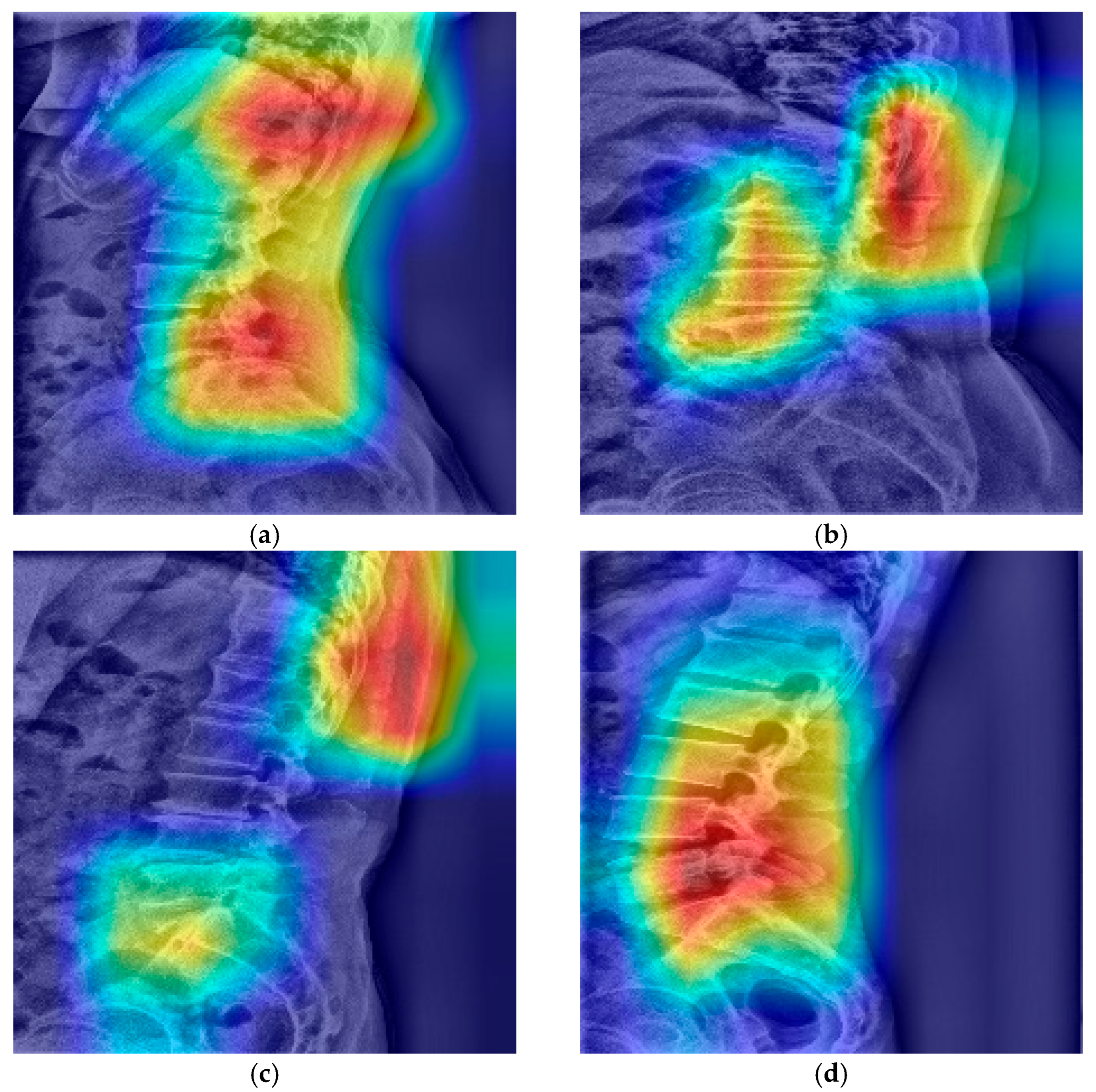The gradient-weighted class activation mapping (Grad-CAM) visualizations provided insight into the model’s decision-making process. For correctly classified cases, the model consistently focused on clinically relevant regions, particularly the lumbosacral junction including vertebral alignment, the L5–S1 disc space, and the T12 rib. This suggests that the model learned to recognize anatomical features similar to those used by human experts (