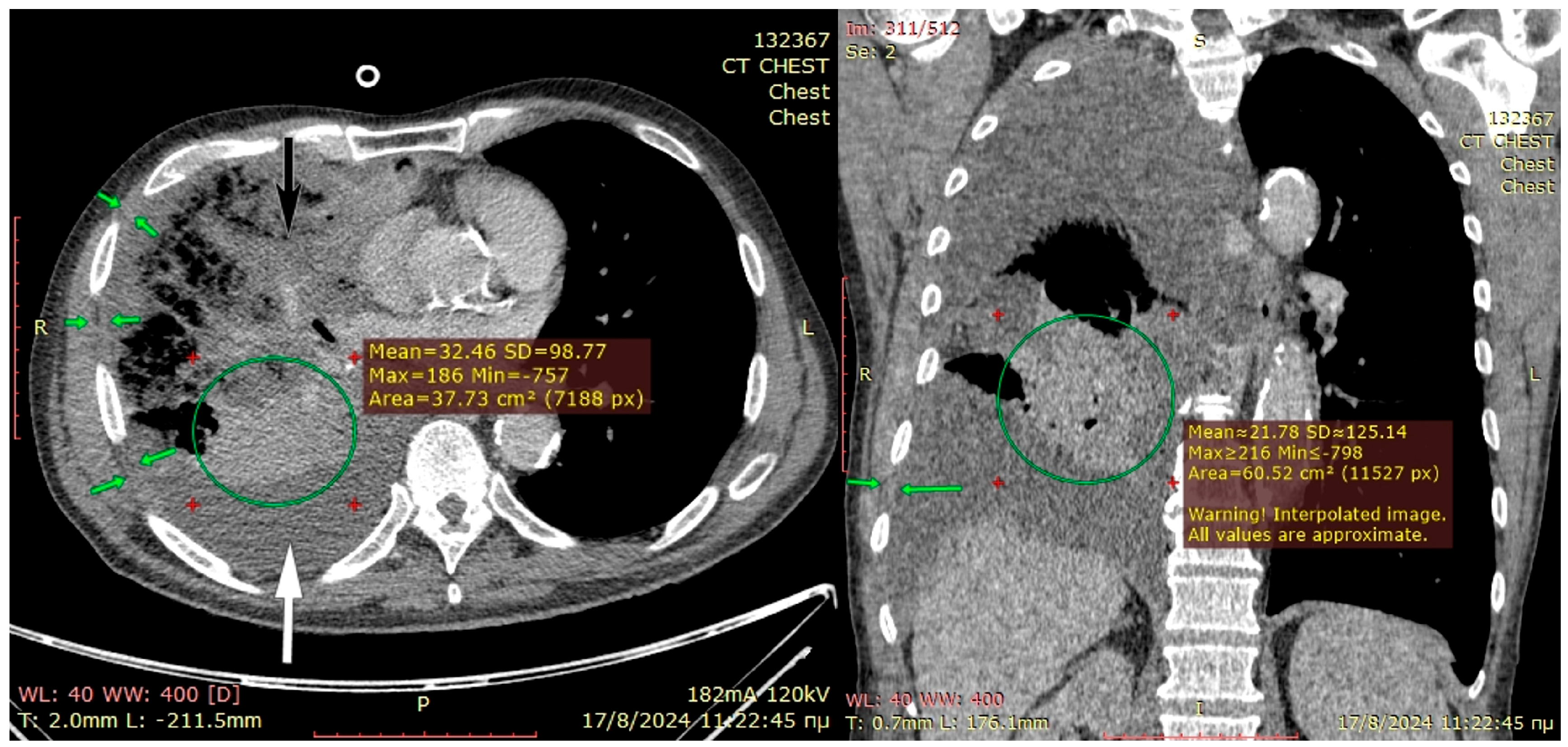 Figure 3. The patient became septic and developed middle-lobe necrosis, for which he underwent an acute open lobectomy combined with an unsuccessful decortication of the remaining two lobes due to emphysematous frail parenchyma and post-operatively had limited recovery from sepsis. He was scheduled two weeks later for window thoracostomy and vac-therapy. At re-thoracotomy, the thickened parietal pleura was easily mobilized from the chest wall; therefore, the intercostal muscles were carefully dissected off the ribs and, along with the thick pleura, were placed deep in the pleural cavity and sutured at the right hemidiaphragm and lower lobe visceral pleura, using prolene 3-0 sutures. Two chest drains were inserted, and a vacuum device was applied in the subcutaneous space, rather than a drain, because the skin and subcutaneous layers were inflamed from the thoracotomy for middle-lobectomy that had been performed 4 weeks earlier. The patient recovered from pleural sepsis with vacuum therapy discontinued after 4 weeks with good wound healing. He remained afebrile and hemodynamically stable without any supplemental oxygen, and free from a demanding thoracostomy window that would require months-long attendance by specialist nurses.