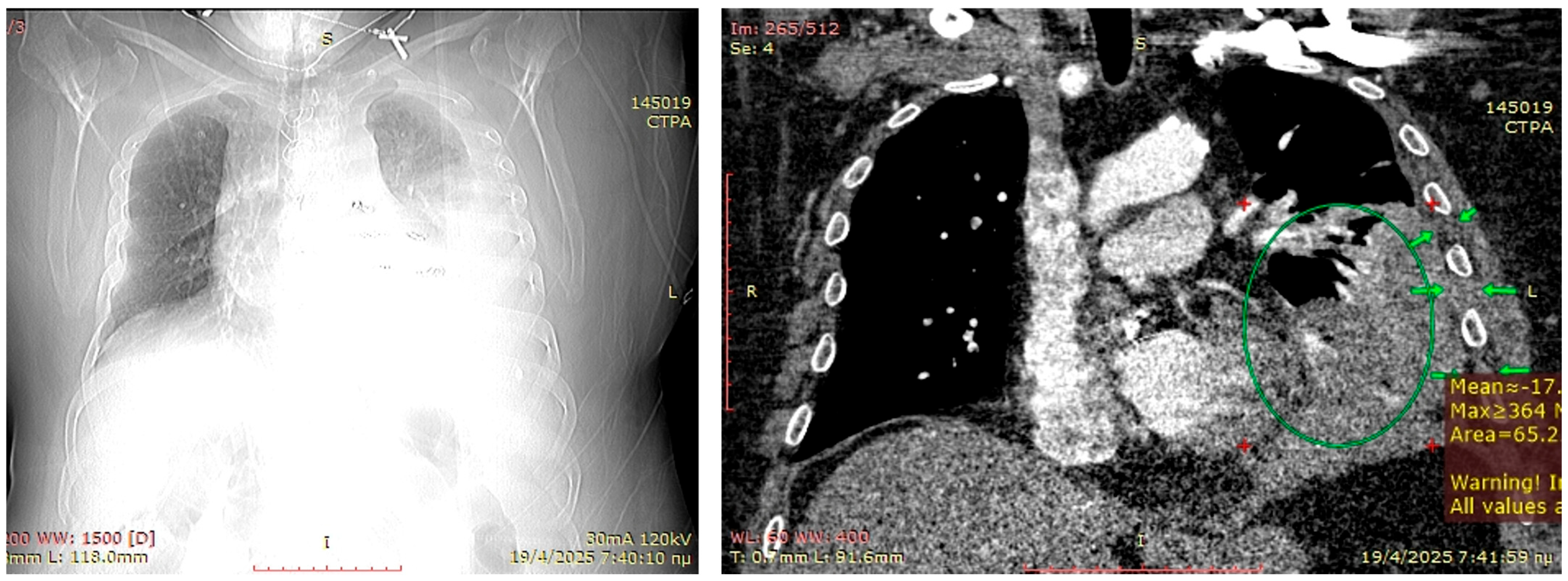 Figure 4). A small ruptured abscess could not be excluded. On acute basis, the patient underwent an exploratory left lower antero-lateral thoracotomy at the 7th intercostal space. The pleural cavity had blood clots present, and the lower lobe was necrotic on the lateral segment. Selective bronchial closure for single lung ventilation was insufficient to maintain acceptable O