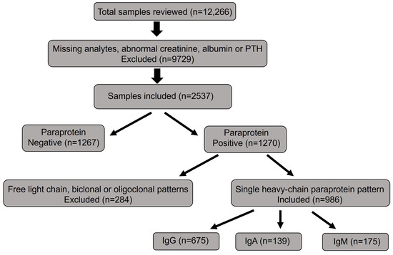 Sample inclusion and stratification flowchart. Flow diagram showing selection of study samples. A total of 2537 de-identified specimens were included; those with missing data or abnormal creatinine, albumin, or PTH values were excluded. Among 1270 paraprotein-positive cases, 986 with a single heavy-chain paraprotein (IgG = 675, IgA = 139, IgM = 175) were retained after excluding samples with free light chain, biclonal, or oligoclonal patterns.
