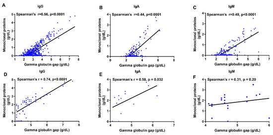 Correlation analyses of paraprotein level and gamma globulin gap in various paraprotein subtypes: (A–C) Correlation analysis across the entire study group (IgG: n = 675; IgA: n = 139; IgM: n = 175). (D–F) Correlation analysis on samples with abnormally high gamma globulin gap (>4 g/dL) only (IgG: n = 61; IgA: n = 14; IgM: n = 19).
