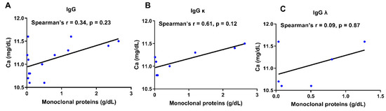 Correlation analyses of paraprotein levels and calcium status in samples with abnormally high calcium levels (Ca > 10.5 mg/dL) for IgG subtype ((A) n = 14), IgG Kappa ((B) n = 8), and IgG Lambda ((C) n = 6).