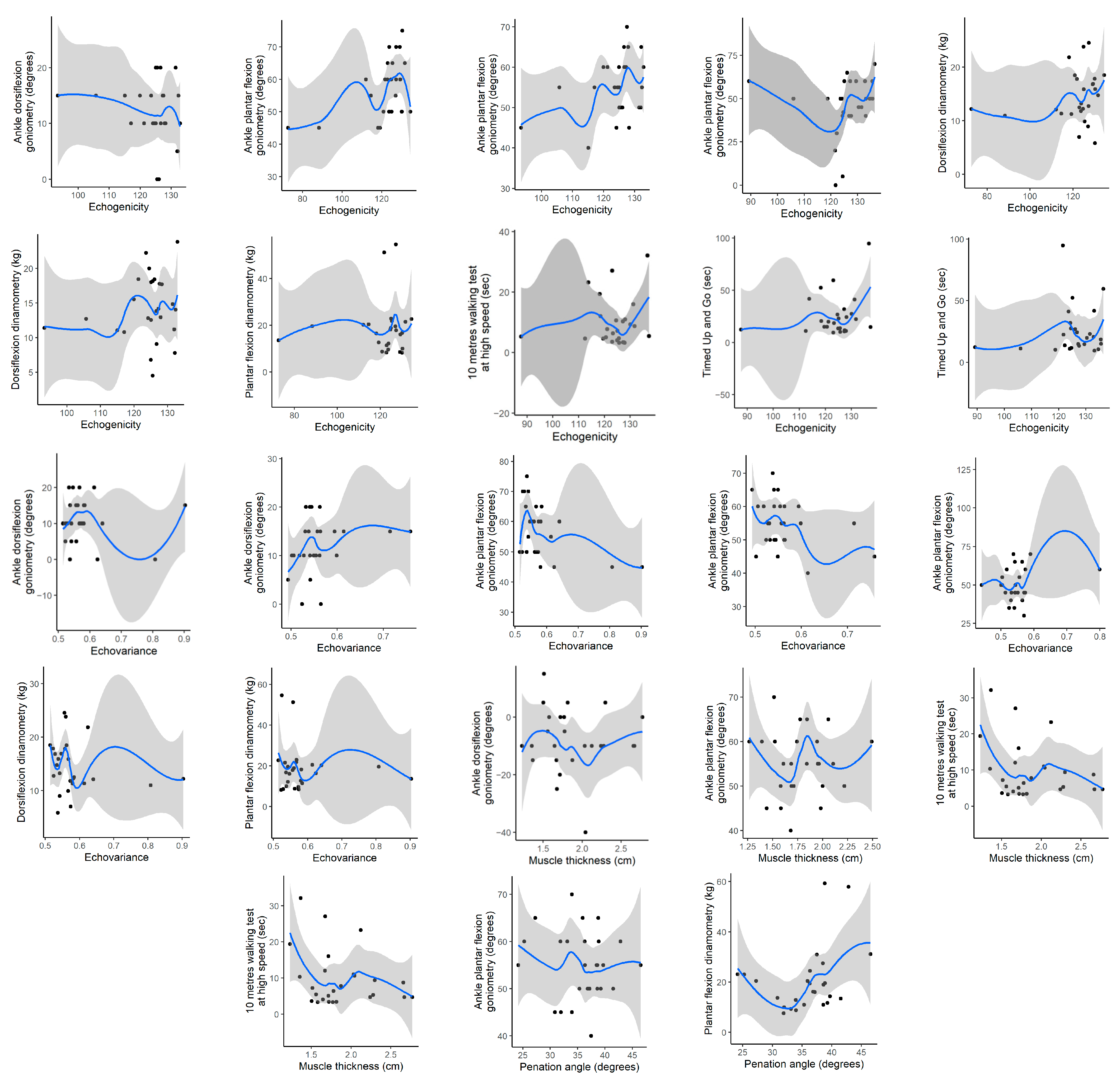 | Muscle thickness (cm) | Ankle dorsiflexion goniometry (°) | −0.025, p = 0.043 | 0.06, p = 0.742 | 0.016, p = 0.704 | −0.139, p = 0.39 |