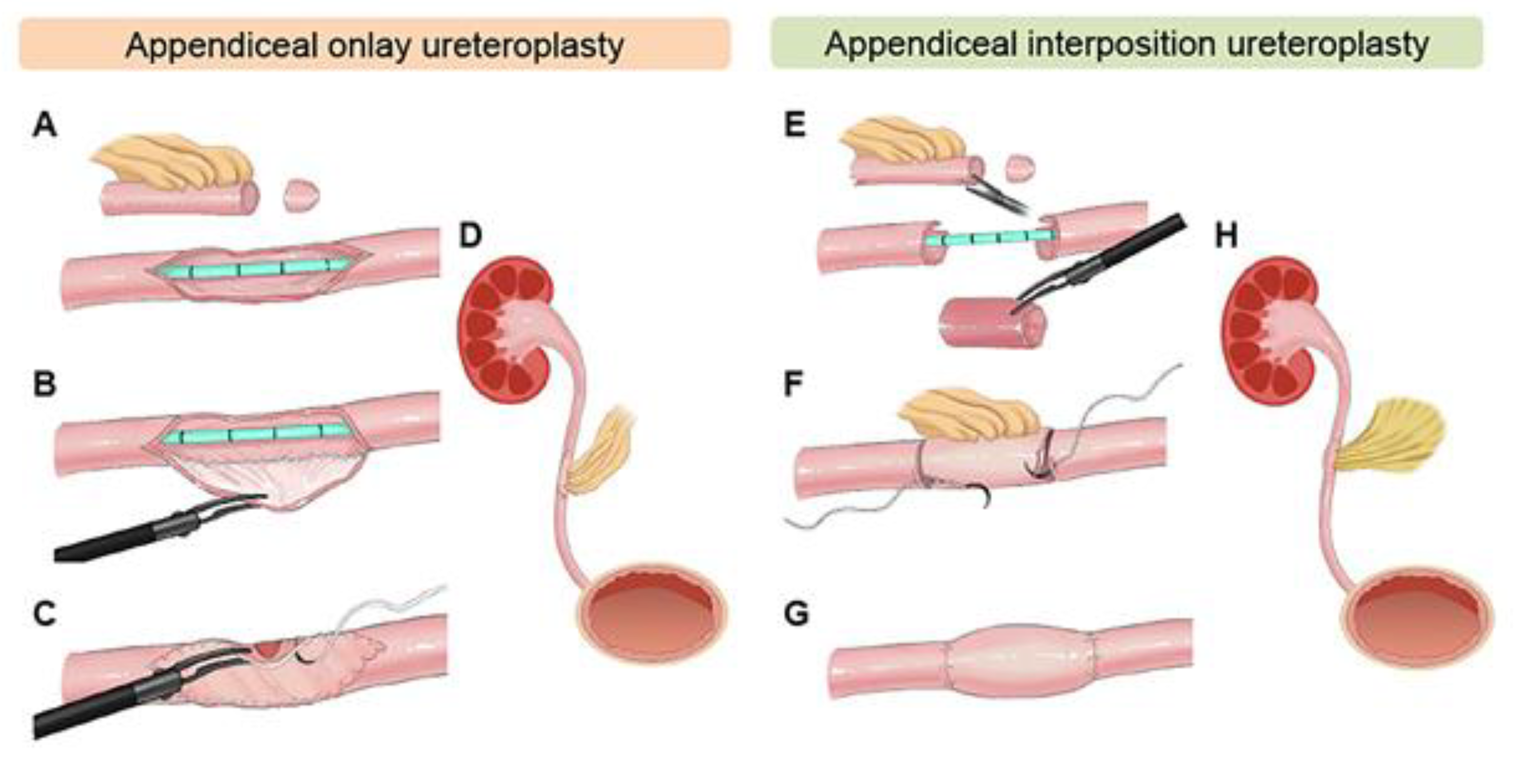 Overall, the use of appendiceal onlay and interposition in ureteroplasty is a viable option for the repair of complex or recurrent ureteral strictures, particularly on the right side, due to its favorable tubular shape, vascular supply, and epithelial lining, while limiting morbidity related to bowel reconstruction.