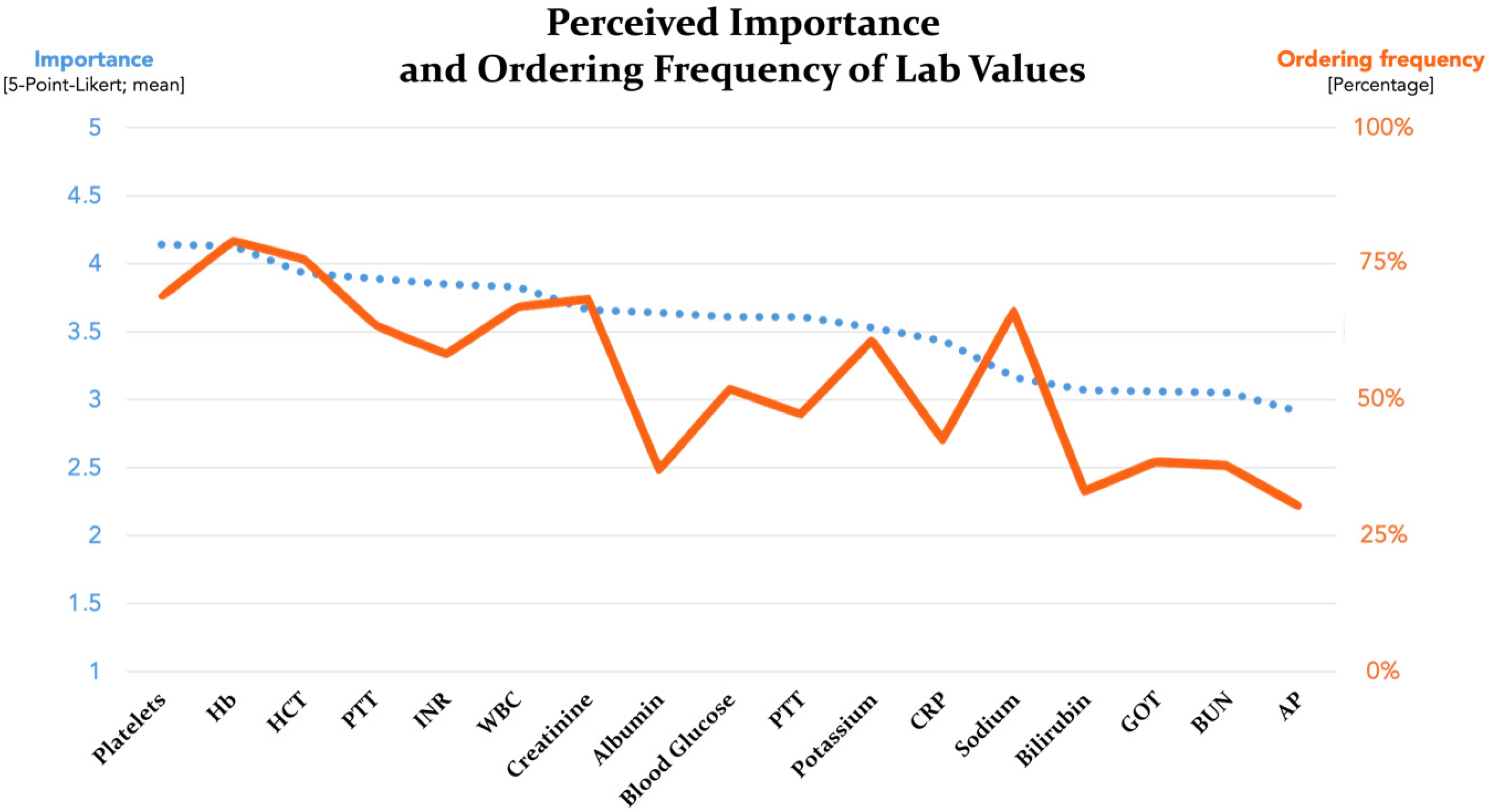 | Percentage of Study Participants Routinely Ordering the Laboratory Value | Perceived Importance of Laboratory Value for Preoperative Risk Stratification | ||