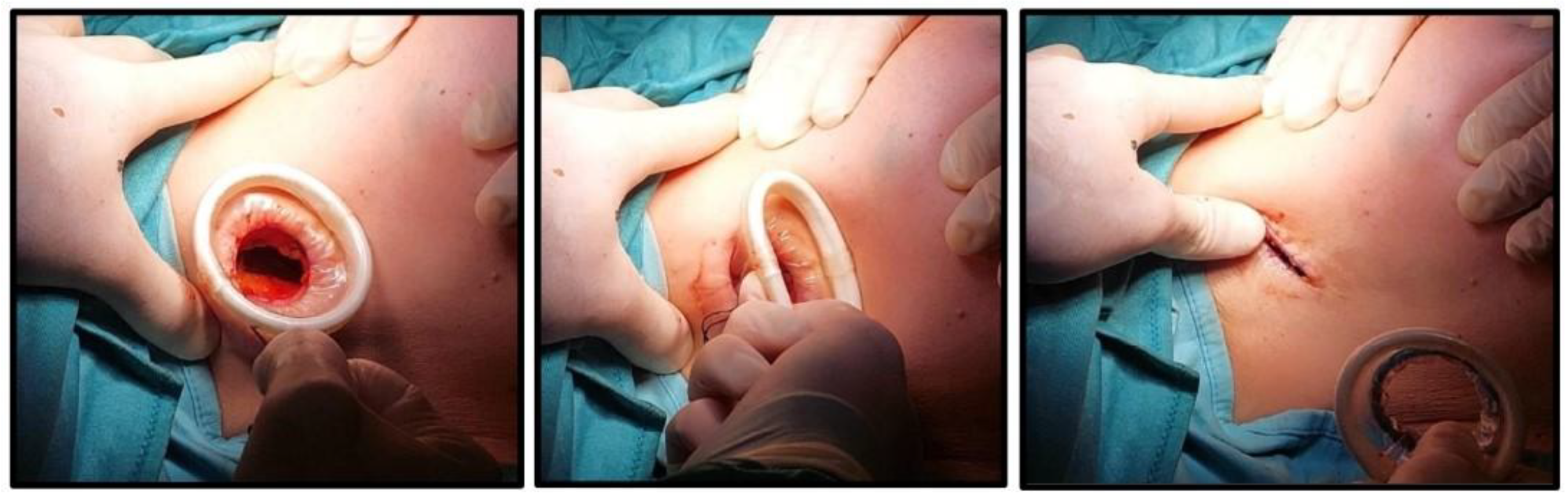 - Scolari Childress, K.M.; Gavard, J.A.; Ward, D.G.; Berger, K.; Gross, G.A. A barrier retractor to reduce surgical site infections and wound disruptions in obese patients undergoing cesarean delivery: A randomized controlled trial. Am. J. Obstet. Gynecol. 2016, 214, 285.e1–285.e10. [Google Scholar] [CrossRef] [PubMed]