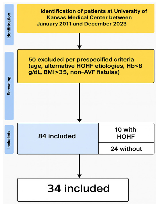 A total of 84 patients with AV fistulas were initially identified based on the inclusion criteria. Of these 84 patients, 50 were excluded according to the previously mentioned criteria. The final cohort consisted of 34 patients (Figure 1). Among the final 34 patients, HOHF was observed in 10 patients (29.41%). The basic characteristics of the final cohort are detailed in Table 1.