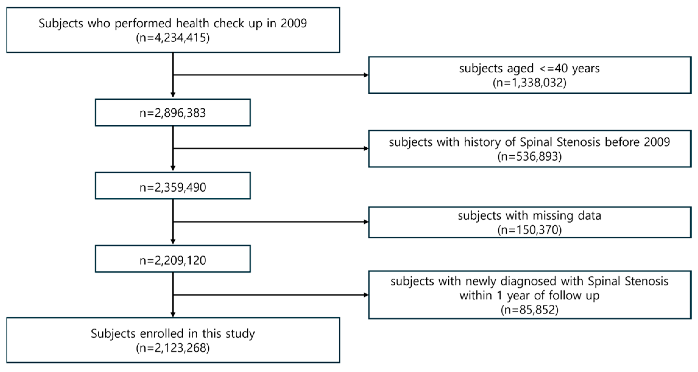 APA StyleRyu, J.-H., Kim, K.-W., & Kim, J.-Y. (2025). Long-Term and Heavy Smoking as a Risk Factor for Lumbar Spinal Stenosis: Evidence from a Large-Scale, Nationwide Population-Based Cohort. Journal of Clinical Medicine, 14(21), 7691. https://doi.org/10.3390/jcm14217691