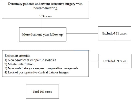 The information of all patients who underwent deformity correction surgeries for adolescent idiopathic scoliosis between May 2017 and March 2025 was extracted from the institution’s digital medical records and analyzed. Inclusion criteria: (1) deformity correction with neuromonitoring and (2) more than one year of follow-up. Exclusion criteria: (1) non-idiopathic scoliosis, (2) mental retardation, (3) non-ambulatory or severe preoperative paralysis, and (4) lack of postoperative images or clinical data. A review of medical records identified 153 patients (117 females and 36 males; mean age, 19.3 years) who met the inclusion criteria. Of these, 38 patients were excluded as they met one or more exclusion criteria, and 11 patients declined to provide consent for participation or less than one year follow-up, resulting in their exclusion from the study (Figure 1).