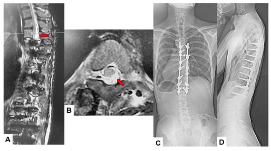 True TcMEP-positive case. 18-year-old male, AIS, Postoperative MRI and revision surgery. Red arrows indicate an acute spinal epidural hematoma. (A) Postoperative T2-weighted sagittal MR imaging, (B) postoperative T2-weighted axial MR imaging at T4, (C) final posteroanterior radiogram, and (D) final lateral radiogram.