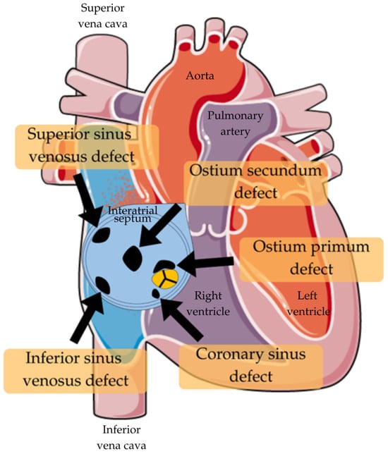 ASD describes a condition where the right and left atria don’t close completely and remain open even after birth. There are four types of atrial septal defects depending on the location: ostium secundum defect (accounting for the majority of ASD cases), ostium primum defect (constituting 10% of ASD cases)—frequently associated with trisomy 21, sinus venosus defect, and coronary sinus defect [1,5,7,25,26]. Among them, the ostium secundum defect is the most common, serving as a window between the two atria that should not exist after birth. This defect permits abnormal left-to-right shunting of blood due to postnatal pressure gradients between the atria [1,5,7,25].