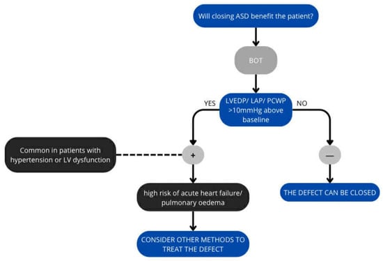 Given the risks associated with the operation, the benefits of surgery must be assessed before making a final decision on ASD closure (Figure 3). The balloon occlusion test is used for this purpose. The balloon occlusion test (BOT) in heart failure patients, particularly those with an atrial septal defect, is an invasive procedure to predict the risk of acute left ventricular failure after permanent closure [6,72].