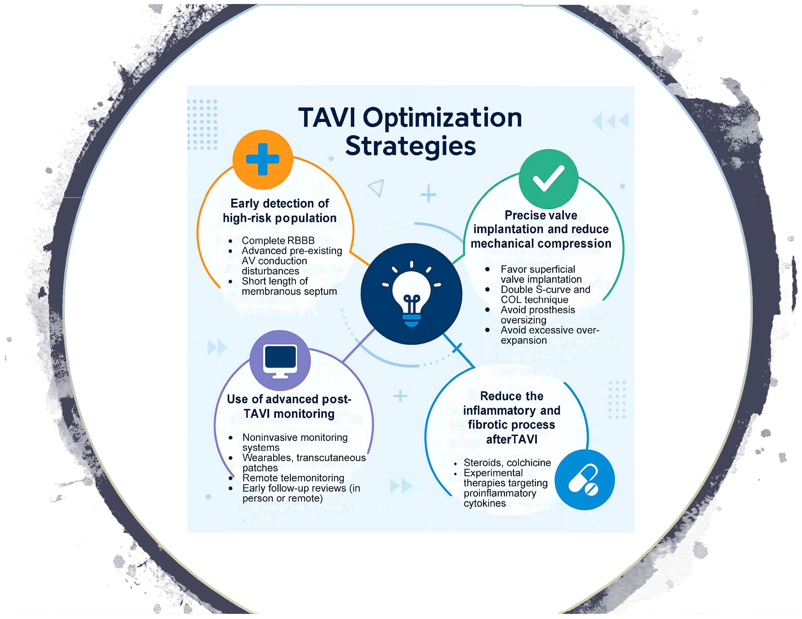 Despite advances in procedural techniques and patient selection, the inflammatory and fibrotic response triggered by prosthesis deployment remains a significant contributor to conduction system injury after TAVR. Therefore, attention has shifted toward strategies aimed at attenuating the inflammatory and fibrotic cascades responsible for post-TAVR conduction abnormalities.