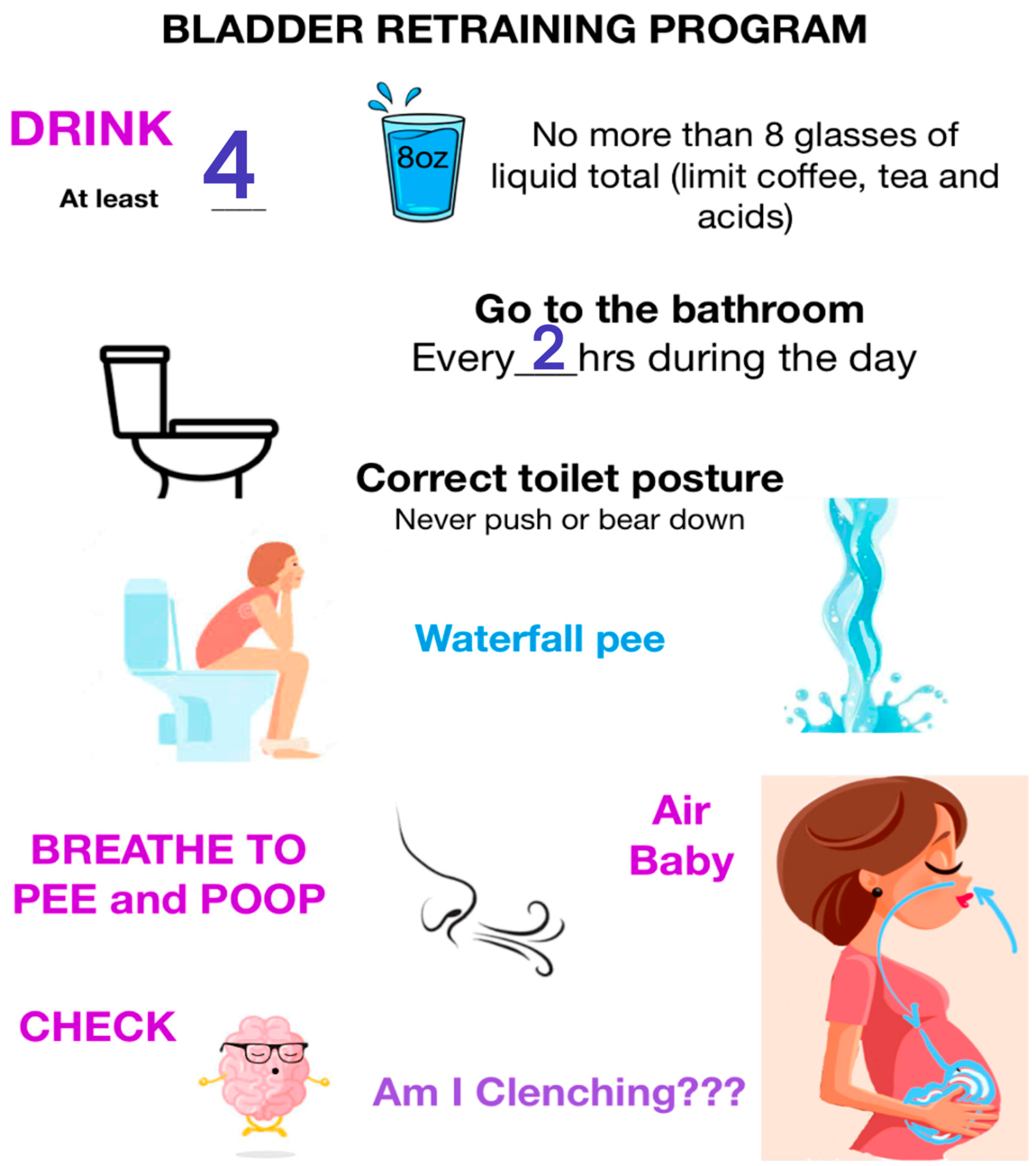 Timed voiding: Voiding every 2 to 3 h (except during sleep) to discourage holding behaviors as well as “just in case” voiding.