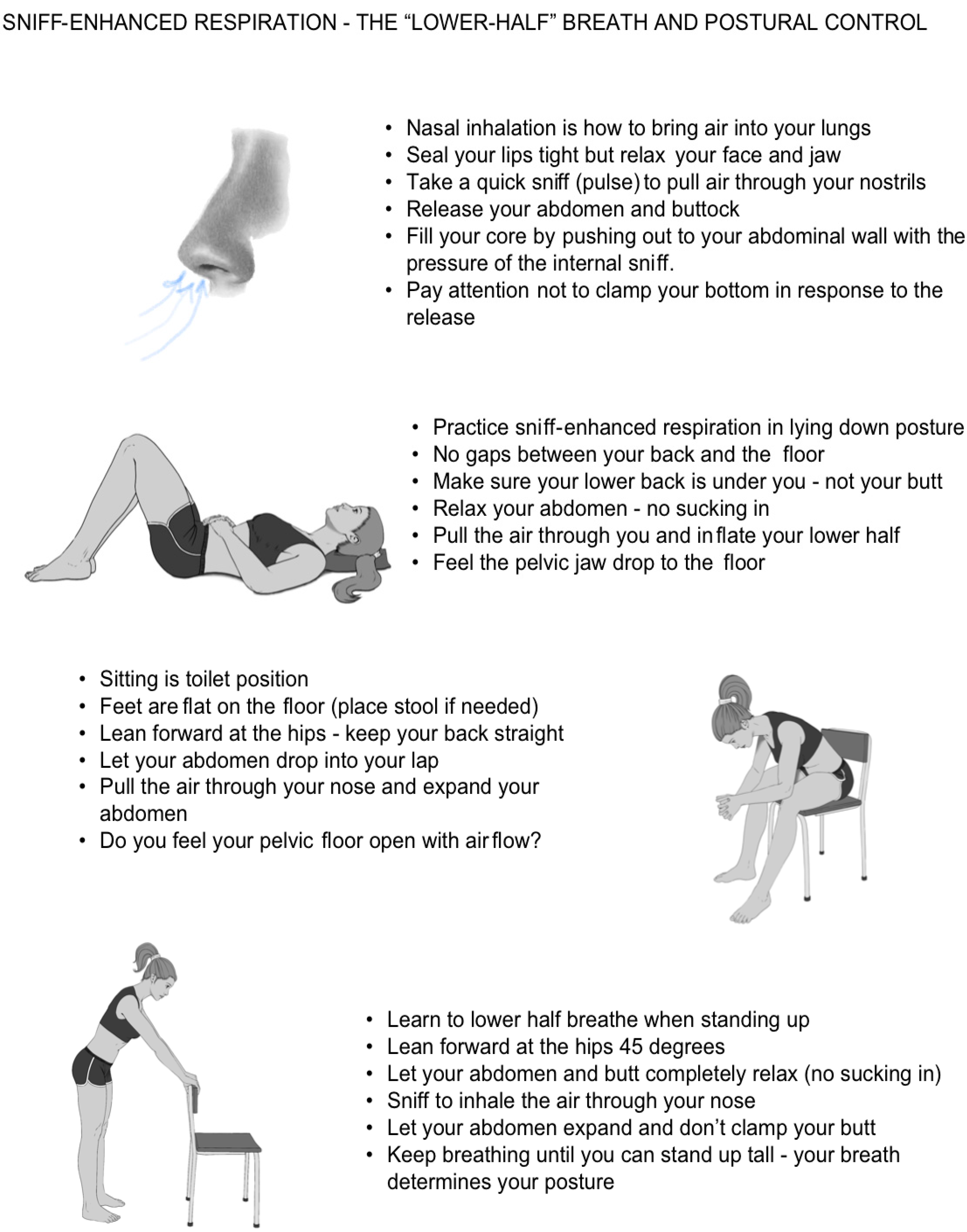 • Breathing initiation: Training with a volitional sniff to activate diaphragmatic descent (sniff-enhanced respiration, SER) and trigger awareness of pelvic release.