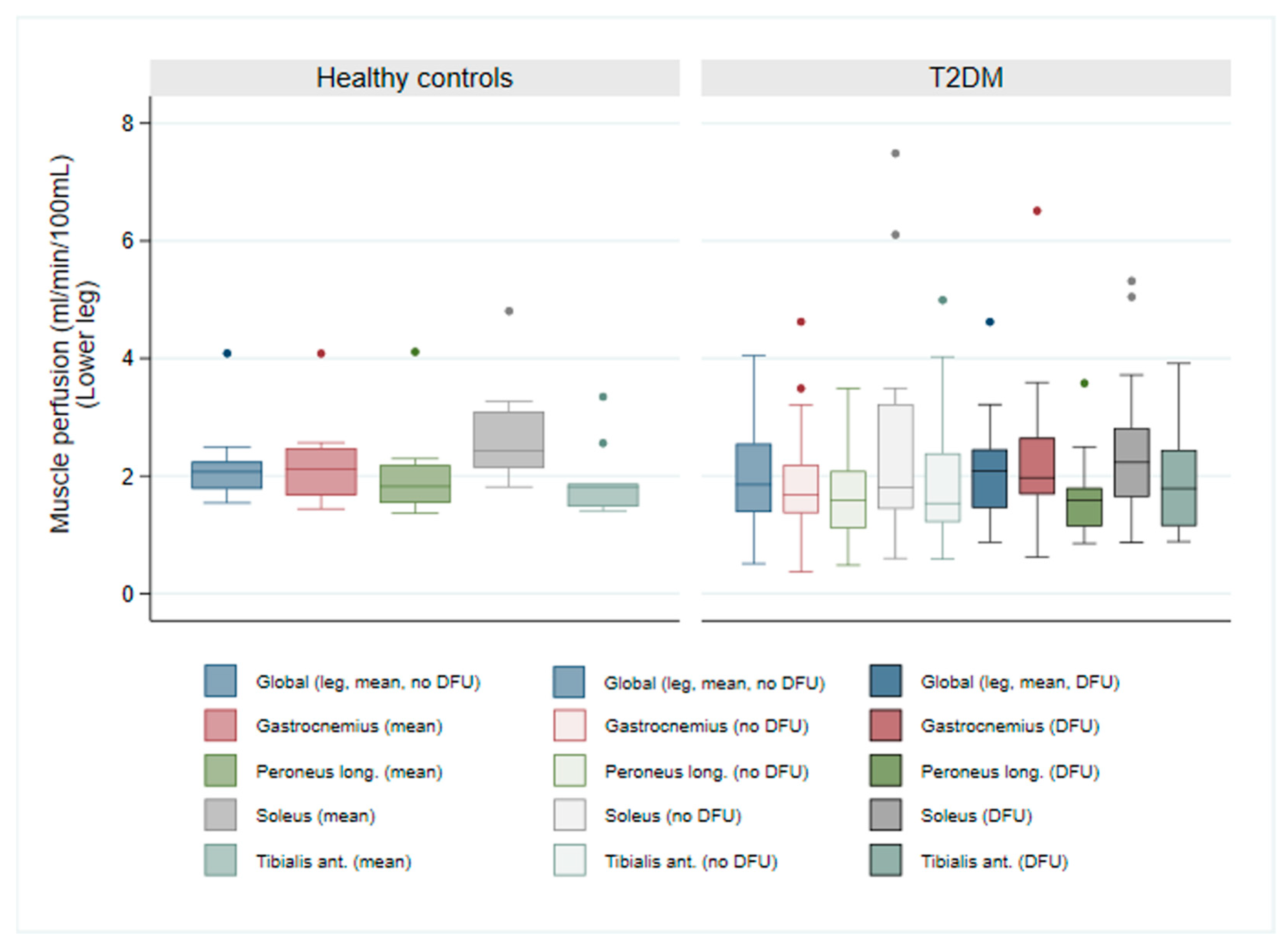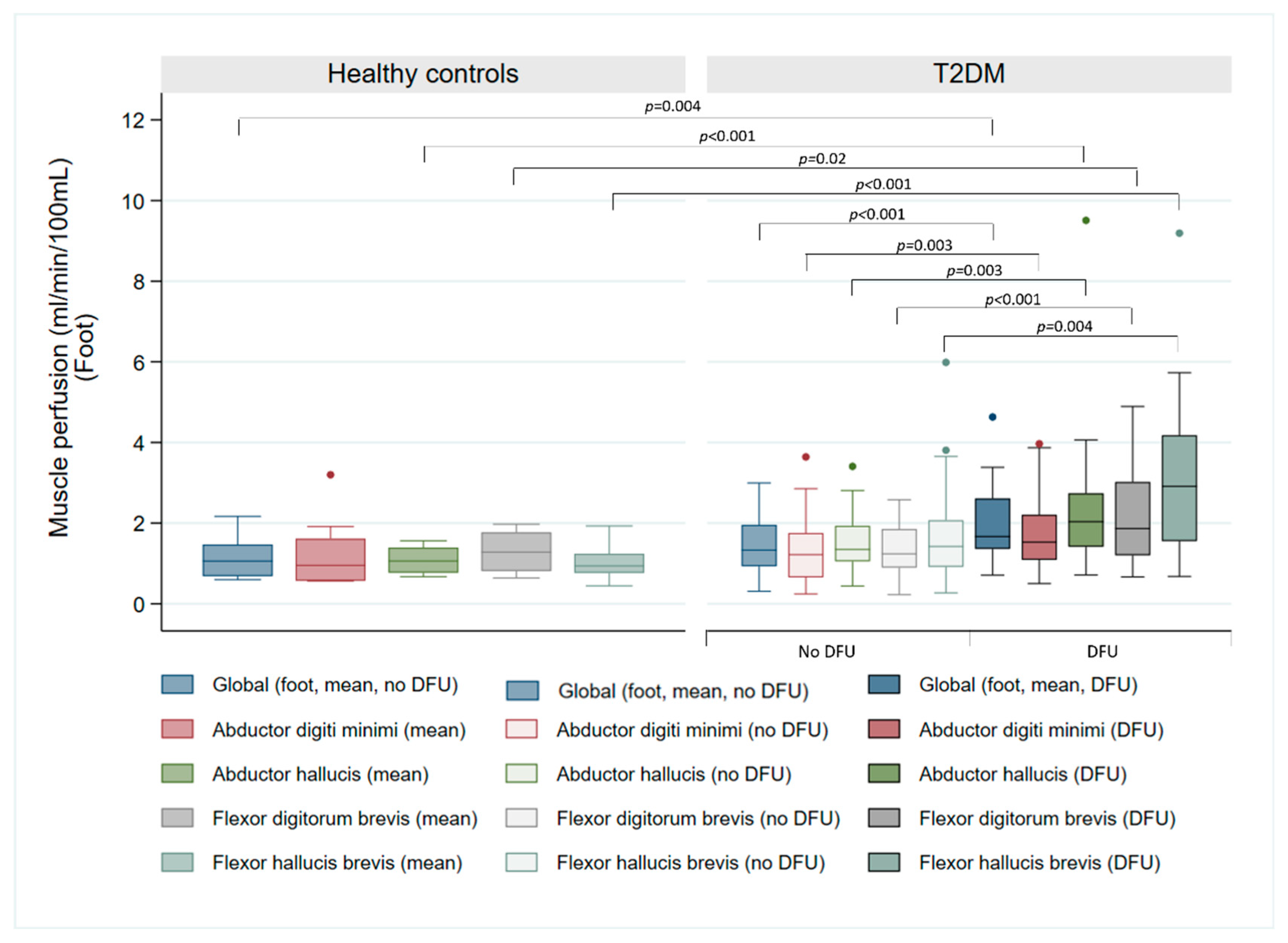 - Zheng, J.; Li, R.; Dickey, E.E.; Yan, Y.; Zayed, M.A.; Zellers, J.A.; Hastings, M.K. Regional skeletal muscle perfusion distribution in diabetic feet may differentiate short-term healed foot ulcers from non-healed ulcers. Eur Radiol. 2023, 33, 3303–3311. [Google Scholar] [CrossRef]