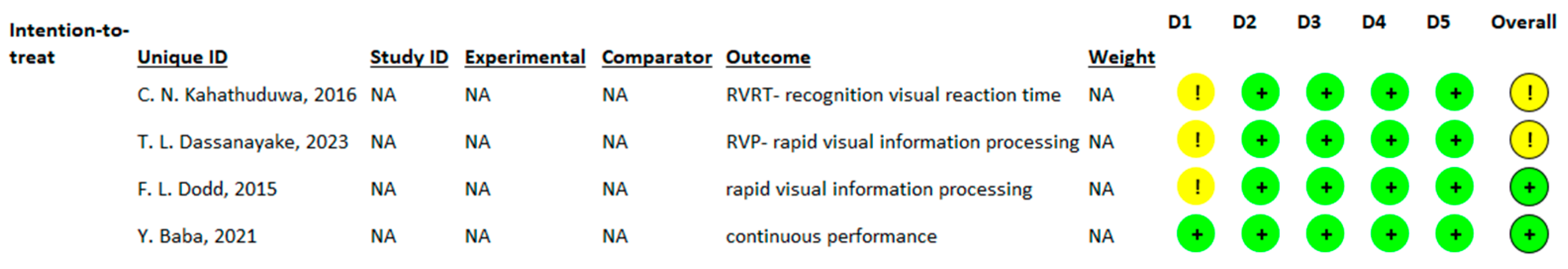 3.3.3. Effects of l-Theanine on Time Required to Process Visual Stimuli (RVIP—Rapid Visual Information Processing/RVRT—Recognition Visual Reaction Time/Continuous Performance)