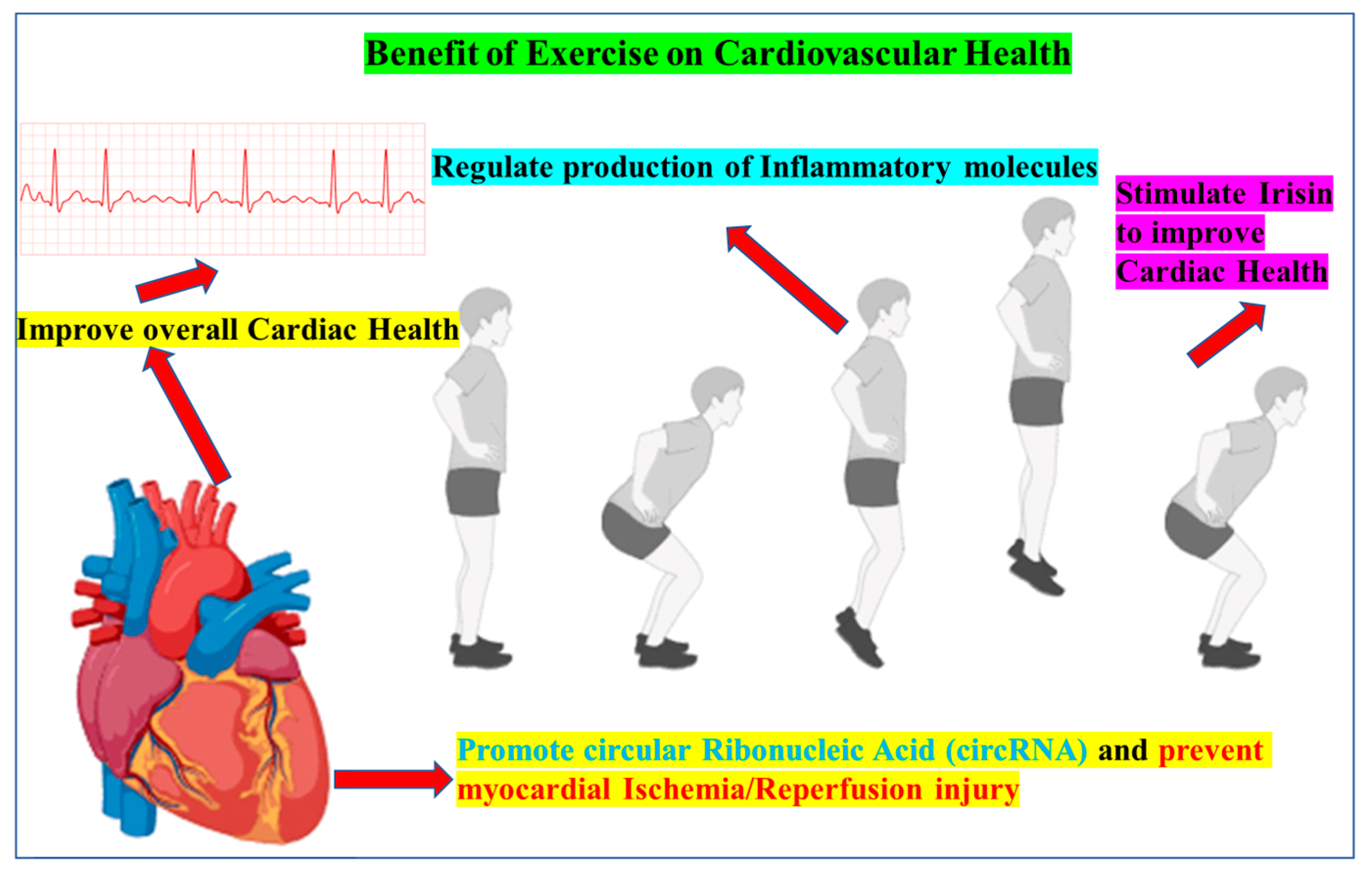 - Wang, L.; Feng, J.; Feng, X.; Meng, D.; Zhao, X.; Wang, J.; Yu, P.; Xu, G.E.; Hu, M.; Wang, T.; et al. Exercise-induced circular RNA circUtrn is required for cardiac physiological hypertrophy and prevents myocardial ischaemia–reperfusion injury. Cardiovasc. Res. 2023, 119, 2638–2652. [Google Scholar] [CrossRef] [PubMed]