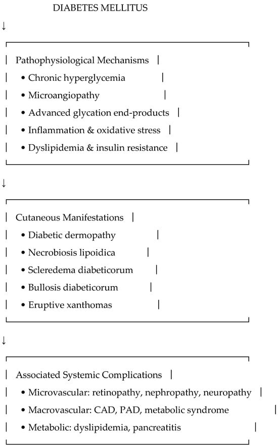 Cutaneous manifestations occur in more than 30% of diabetic patients and can often precede or accompany systemic complications []. The skin, as the largest and most visible organ, reflects systemic metabolic and vascular changes. Historically, these manifestations were considered of secondary importance or cosmetic. However, increasing evidence demonstrates that dermatological changes not only mirror underlying systemic dysfunction but may also serve as early predictors of microvascular and macrovascular disease [,].