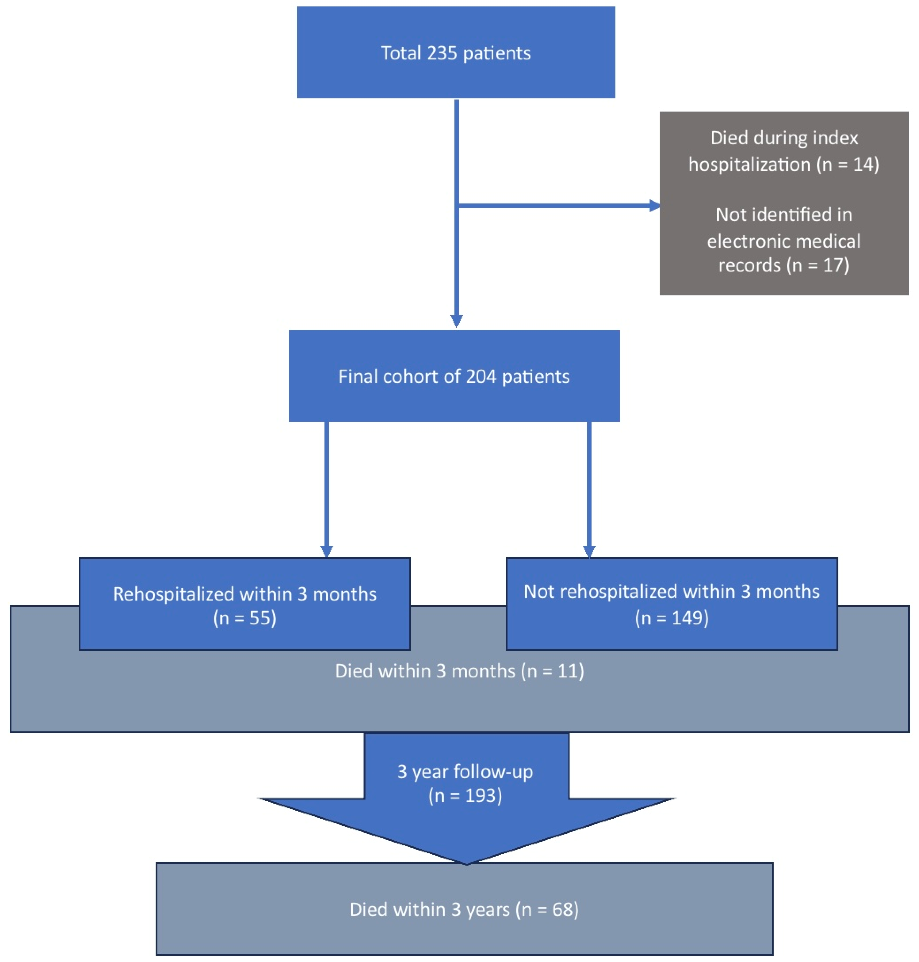 The initial database included 235 patients. After excluding patients who died during the index hospitalization (14 patients) and those not identified in the unified medical system (17 patients), the final sample included 204 patients. The flow-chart is presented in