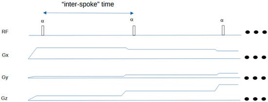 Timing diagram for Silent sequence. The first two spokes of a typical 3D-radial sequence are shown. The FID signal is acquired following each RF excitation pulse. The three dots on the right indicate that the sequence then repeats. The “inter-spoke” time can be taken as a repetition time for MR signal evolution calculations in a spoke-train.