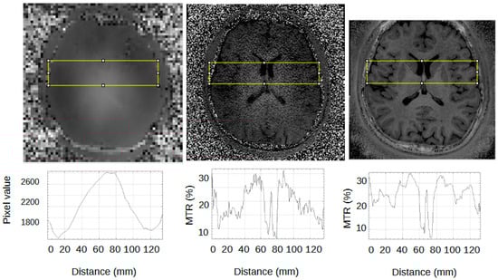 The axial location of the Gradient-Echo MTR map was identified in the Silent MTR map using location information from the original source DICOM images. The relevant (reconstructed axial) Silent MTR map was compared with the MTR map from the Gradient-Echo sequence and with the B1 map in a side-by-side review using ITK-SNAP (University of Pennsylvania, PA, USA). Profiles along the left-right direction were measured to visually assess left-right uniformity in the two MTR maps.