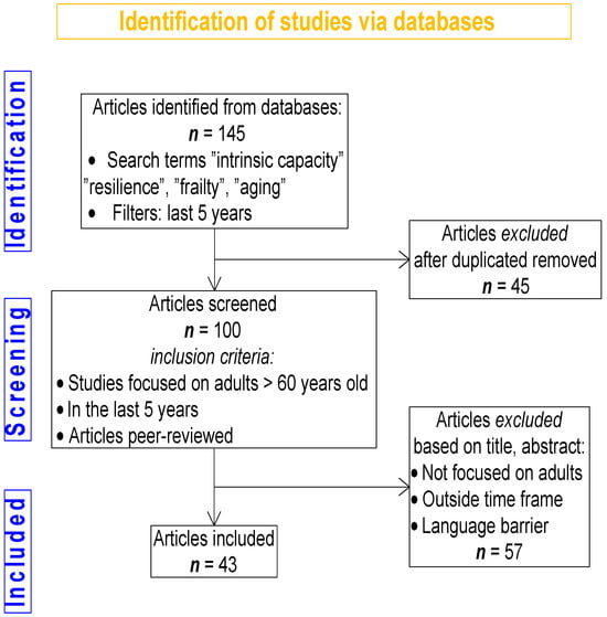 This research is a narrative review that encompasses a selection of the most significant articles published within the last five years on resilience and intrinsic capacity, alongside earlier significant works considered relevant to the subject matter. Articles were primarily searched in English. Searches were conducted in reputable databases, such as PubMed, Google Scholar, and Scopus, using the following specific search terms: “resilience”, “intrinsic capacity”, “frailty”, and “aging”. To broaden the search, Boolean operators such as “AND” and “OR” were employed to combine search terms and capture a wider range of relevant studies. The inclusion criteria were as follows: peer-reviewed conceptual, observational, and interventional articles, alongside meta-analyses and systematic reviews of randomized controlled trials, addressing resilience and/or intrinsic capacity in adults ≥ 60 years old/older adults from 2020 to 2025. Exclusion criteria included studies not focused on humans and older adults, studies published outside the date range, and studies not available in English. Although 145 relevant references were reviewed and cited for completeness, a total number of 43 articles were included in this narrative review after the application of inclusion and exclusion criteria. A flow diagram illustrating the study selection process is presented in Figure 1.