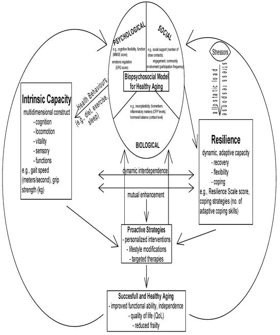 The development of IC is shaped by biology and psychological and social factors, which makes it consistent with a biopsychosocial model of aging. The relationship between IC and environmental supports demonstrates that healthy aging depends both on individual capability and accessible enabling environments. Recent geriatric paradigms emphasize intrinsic capacity (IC) and resilience, moving beyond deficit-focused models like frailty, positioning IC and resilience as holistic, dynamic elements capturing the heterogeneity of aging at individual levels. Expounding on this, Chhetri et al. conceptualize IC as an integrative proxy for physiological reserve and a foundational determinant of physical resilience (PR), the ability to withstand and rebound from stressors [62].