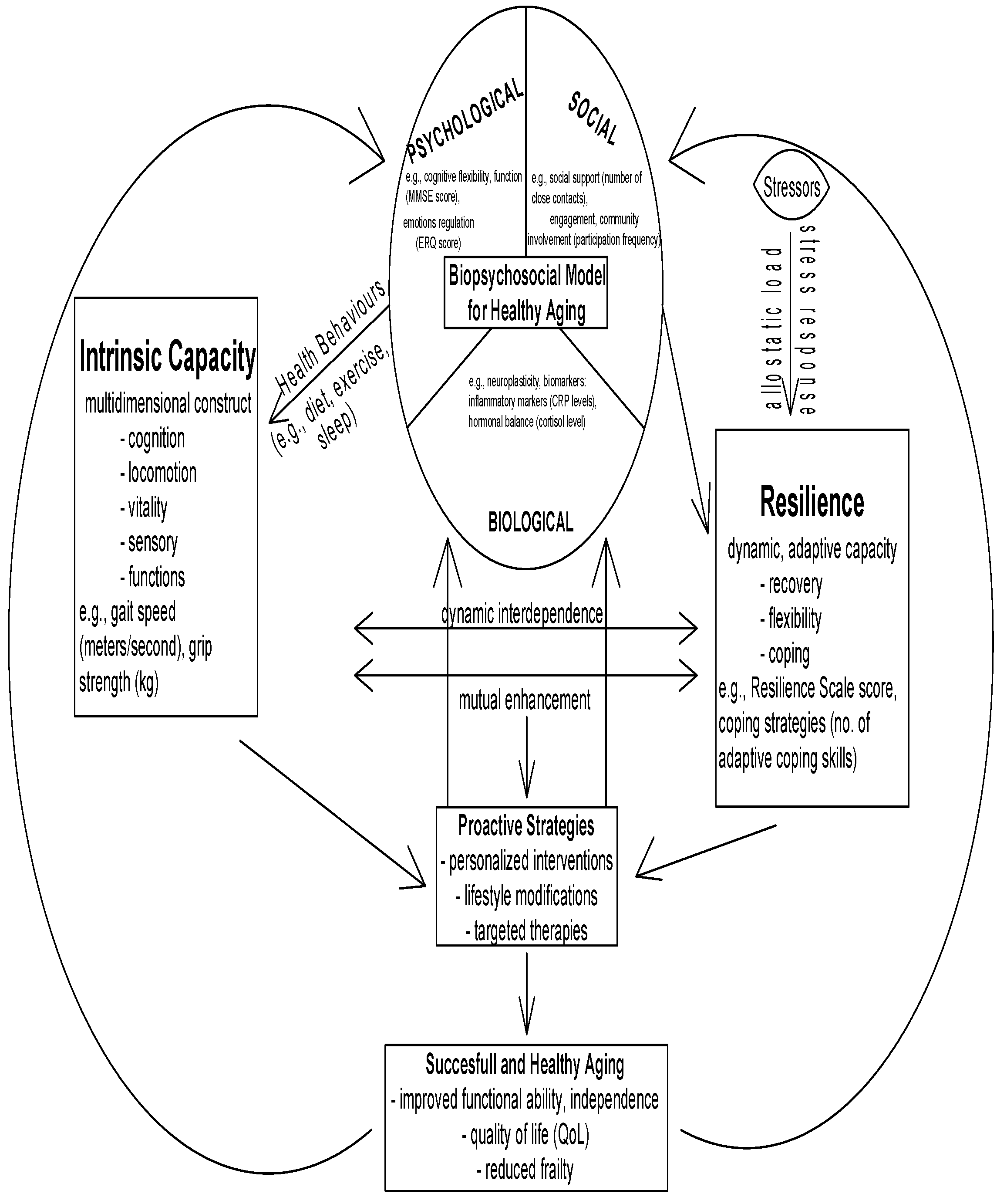 Physical resilience (PR) is the ability to resist functional decline and recover from physical stressors such as illnesses, injuries, or surgeries. It is based on the physiological reserve and the body’s recovery trajectory, with a focus on maintaining independence, especially in older populations. Recovery patterns, cardiovascular health, muscle strength, and overall physical performance are key factors. Interventions like exercise, proper nutrition, and rehabilitation programs are shown to enhance physical resilience [13,42]. Studies articulate PR as a multidimensional, measurable construct linking molecular, system level, and psychosocial domains, which offers potential for focused interventions in geriatric care [43]. PR focuses on older adults’ responses to challenges instead of fixed health markers to understand the intricate relationship between biological processes and environmental factors in aging. This approach offers a more dynamic and equitable method to foster functionality, inclusion, and well-being in late life, by bridging the gaps left by a traditional successful paradigm. Age-friendly care initiatives prioritize environments and services that support older adults’ mental health and autonomy. A study from 2024 proposes a pluralistic framework that integrates the WHO’s Decade of Healthy Ageing priorities—including combatting ageism, fostering age-friendly communities, and integrated and long-term care, anchored in mental health optimization and accessible across community and healthcare domains [44].