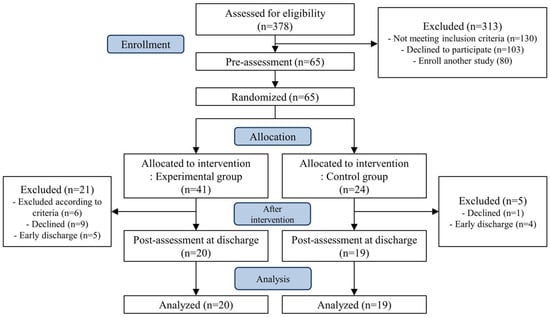 Of the 41 patients assigned to the experimental group, six were excluded based on the exclusion criteria during the intervention that move to intensive care unit or transfer to university hospital due to deteriorating health, nine chose to discontinue, and five were discharged earlier than expected and were unable to complete all sessions. Of the 24 patients in the control group, one withdrew from the study and four were discharged earlier than expected. Finally, 39 patients completed the study, of whom 20 completed respiratory exercises and stabilization techniques (Figure 1).
